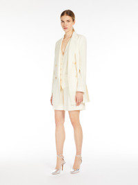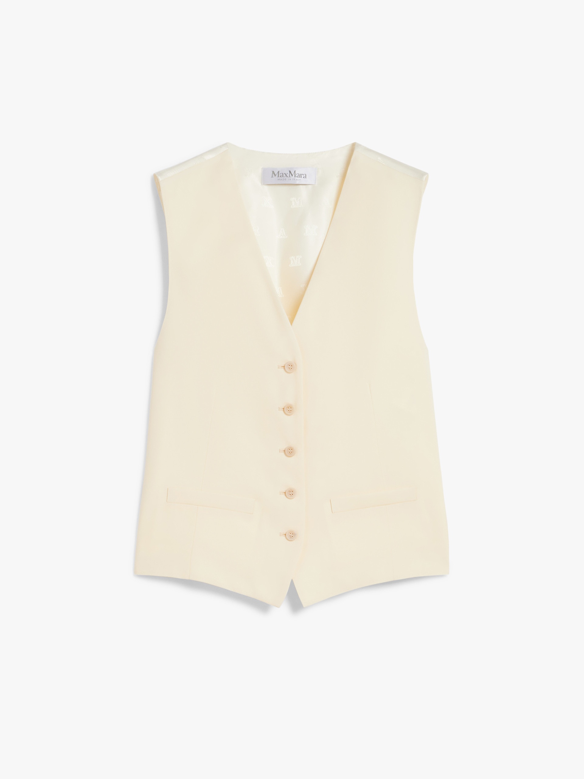 DETAILS Classic men’s-inspired waistcoat, made of lightweight pure wool canvas. The garment features a customised fabric insert on the back and an adjustable drawstring waist on the back. Features a V-neck and welt pockets. Button fastening at the front. COMPOSITION AND CARE Front 100% virgin wool; back 100% viscose; lining 100% viscose. Do not wash; do not bleach; do not tumble dry; cool iron; professionally dry clean perchloroethylene - mild process; do not wet clean.; wash the garment while it is fastened.; do not iron the buttons.; protect buttons before washing.; protect the ends stoppers and/or the cord ends before washing.; turn the articles inside out before washing.; contains non-textile parts of animal origin. Distributed by Max Mara S.r.l., registered office in Reggio Emilia (Italy), Via Giulia Maramotti 4, 42124 (IT)