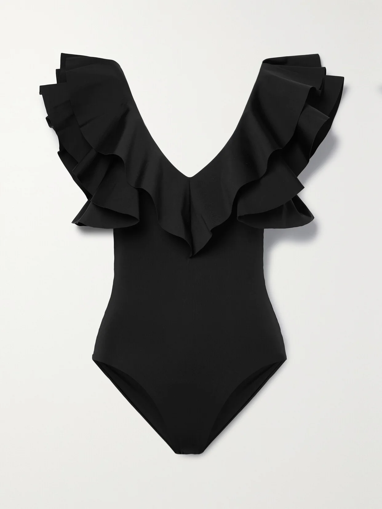 Maygel Coronel's swimwear is designed with a South American flair inspired by the designer's home country of Colombia - each style is locally crafted there, too. This 'Santa' suit is cut from smooth stretch fabric with dramatic ruffles framing its V-neckline. This product was Locally Made. Find out more about NET SUSTAIN here.