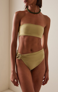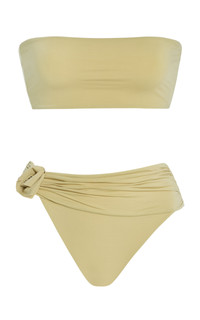 The Colombian talent continues to set a new bar in considerate design with her latest lineup of locally handmade swimwear and beachy dresses. In her signature swim fabric, with memory-shape technology that truly flatters every figure, this season’s are elevated with the couture-inflected details that make her pieces so special. The 'Alheli' bikini has a bandeau silhouette with a high-rise bottom. The rosette detail is a brand signature. PRODUCT DETAILS - Resort '26 - Slip on - Composition: 78% polyamide, 22% elastane - Designer color: Leek Green - Hand wash - Made in Colombia