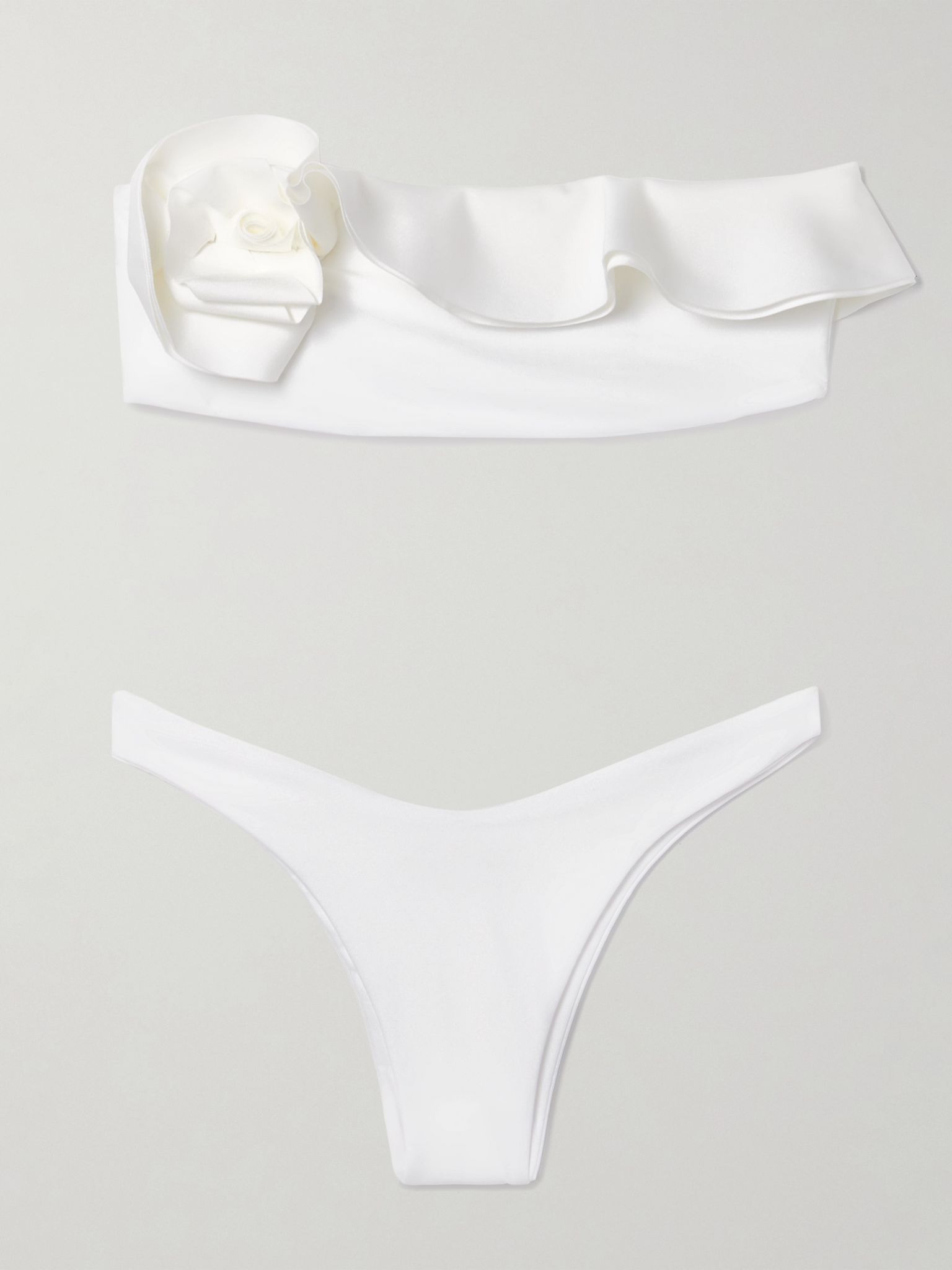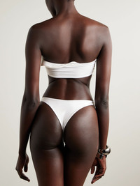Maygel Coronel is dedicated to enriching the quality of life in Colombia - that's why the majority of the brand's designs are produced locally and in-house. This 'Bies' bikini has high-cut briefs and a ruffled bandeau top depicting a signature rosette. Pack it on your honeymoon. Responsible Craftsmanship. This product promotes artisanal skills and a brand that invests in communities and adheres to fair-trade principles. Find out more about our NET SUSTAIN criteria here. Size & Fit - Petite = 2XS-S - One Size = S-L - Extended = L-2XL - Fits true to size, take your normal size - Low-rise, high cut style with minimal coverage - Model is 183cm/ 6'0", bra size 34B and is wearing a size One Size Model measurements: - Bust: 76cm/ 30" - Waist: 64cm/ 25" - Hip: 95cm/ 37.5" Details & Care - White stretch-polyamide - Slips on - 78% polyamide, 22% elastane - Machine wash - Lotion, sunscreen, oil and chlorine can cause discoloration of this item; this is not a manufacturing defect. Please follow care instructions to keep your swimwear in the best condition
