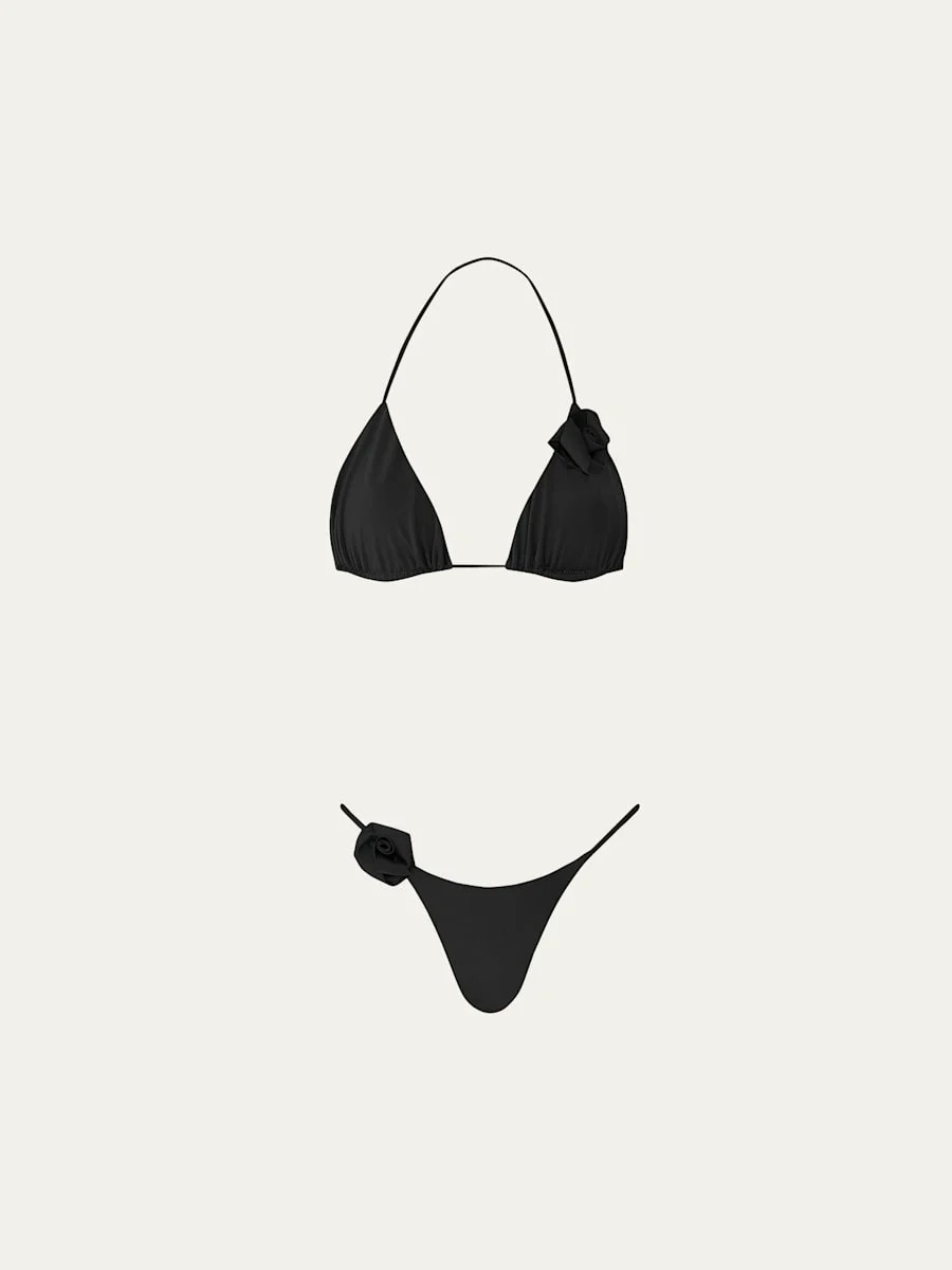 MAYGEL CORONEL "Gola" two-piece swimsuit accented with signature 3D rosettes Halter neckline Triangle cups slide on string Low rise Cheeky seat coverage Nylon/polyamide/elastane Made in Colombia Online Inquiries: BGS21_T6P3D| Store Inquiries: #5022735