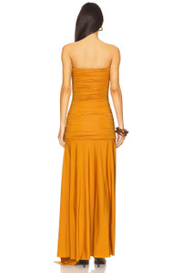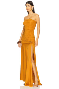 - 78% polyamide - Hand wash cold - Partially lined - Strapless design - Ruched seams - Drop waist design with rose detail - Midweight jersey fabric with side slit design - Neckline to shortest hem measures approx 21" and to longest hem approx 54" in length - Revolve Style No. MAYR-WD38 - Manufacturer Style No. VT-118-MY