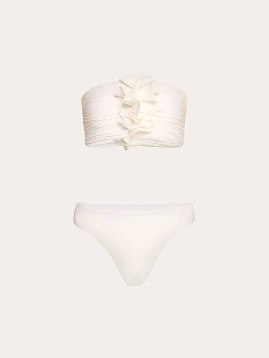 MAYGEL CORONEL "Melao" two-piece swimsuit includes a shirred top adorned with central 3D floral appliqués Strapless neckline Pullover style High waist Cheeky seat coverage Nylon/polyamide/elastane Made in Colombia Model is 5'10"/177cm. Online Inquiries: BGS21_T5G6P| Store Inquiries: #4716815