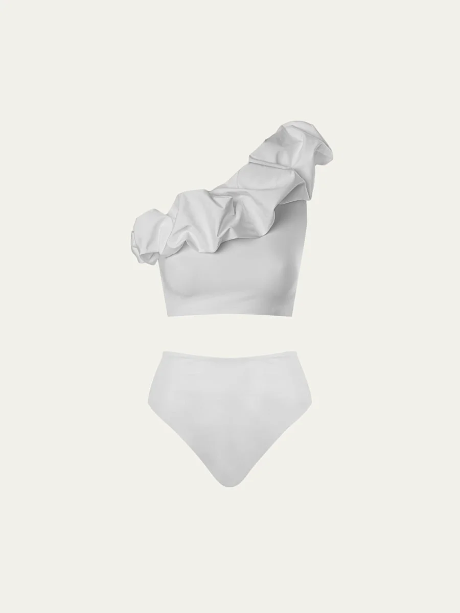 MAYGEL CORONEL "Merly" two-piece bikini set features a statement asymmetric ruffle One-shoulder neckline Mid-back self-ties High waist Moderate seat coverage Polyamide/elastane Hand wash Made in Colombia Model is 5'10"/177cm. Online Inquiries: BGS21_T3CY7| Store Inquiries: #4323250