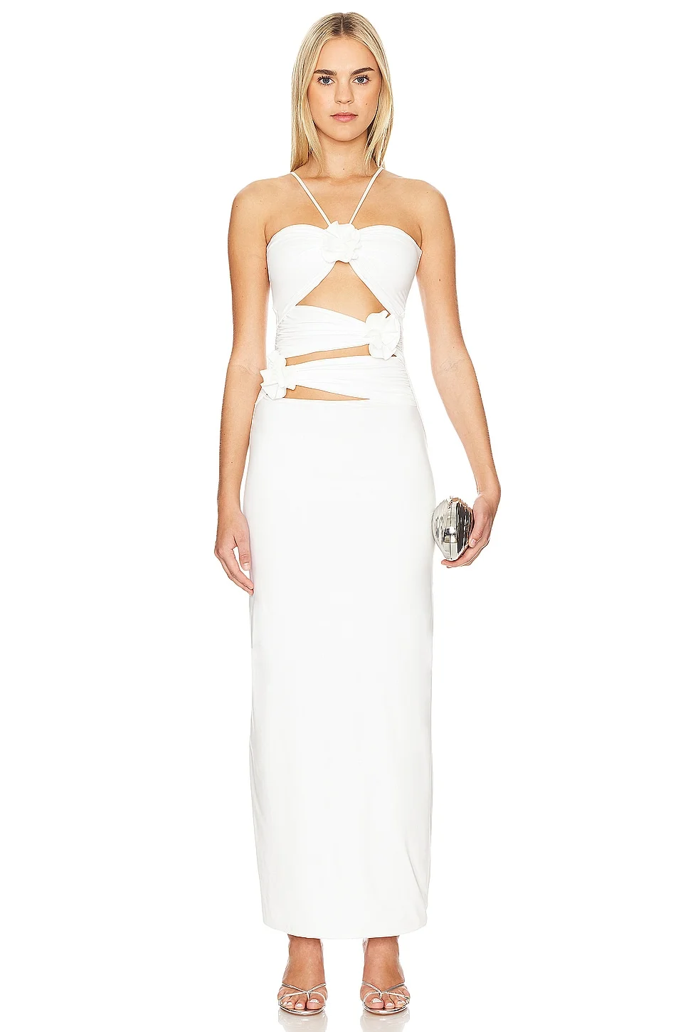 - 78% polyamide 22% elastane - Made in Colombia - Hand wash - Unlined - Pull-on styling Back tie closure - Bodice cut-out with rosette accents - Ruched jersey fabric - Revolve Style No. MAYR-WD5 - Manufacturer Style No. VT-027-WHT
