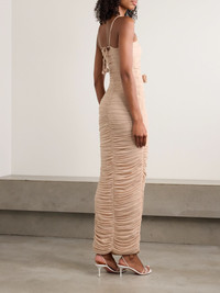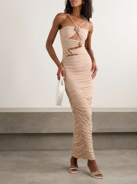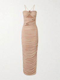 Maygel Coronel's 'Veranera' dress is simply stunning. Made in Colombia from stretch-jersey, it's ruched to hug your frame and artfully bares slices of the torso. It's appliqued with a trio of roses along the neutral bodice. Responsible Craftsmanship. This product promotes artisanal skills and a brand that invests in communities and adheres to fair-trade principles. Find out more about our NET SUSTAIN criteria here. Size & Fit - Petite = 2XS-S - One Size = S-L - Extended = L-2XL - Fits true to size, take your normal size - Designed for a close fit - Lightweight, stretchy fabric - Model is 177cm/ 5'10" and is wearing a size One Size Model measurements: - Bust: 77cm/ 30.5" - Waist: 62cm/ 24.5" - Hip: 88cm/ 34.5" Details & Care - Beige stretch-jersey - Slips on - 77% polyamide, 23% elastane - Unlined - Hand wash