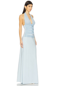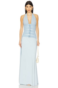 - 78% polyamide 22% elastane - Made in Colombia - Machine wash cold - Fully lined - Halterneck styling - Front draped tonal 3D floral details Open back designs - Midweight coated jersey fabric with ruching - Revolve Style No. MAYR-WD34 - Manufacturer Style No. VT-114-ART