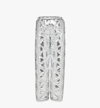 A brilliant insignia of Munich, the Bavarian diamond is represented through geometric quilting on these metallic silver polyester pants. Transitioning effortlessly from slope to street, the oversized silhouette is padded for a voluminous look resulting in increased warmth and comfort. Pair with the matching jacket. - Diamond padded quilting - Zip closure - Front welt pockets - Elasticated waist and cuffs - 100% Metallic Polyester - Oversized fit - Hand wash or delicate dry clean. Do not bleach, rub or soak. Do not iron or tumble dry. - Made in Italy Style # MFPEAMM04SV00L