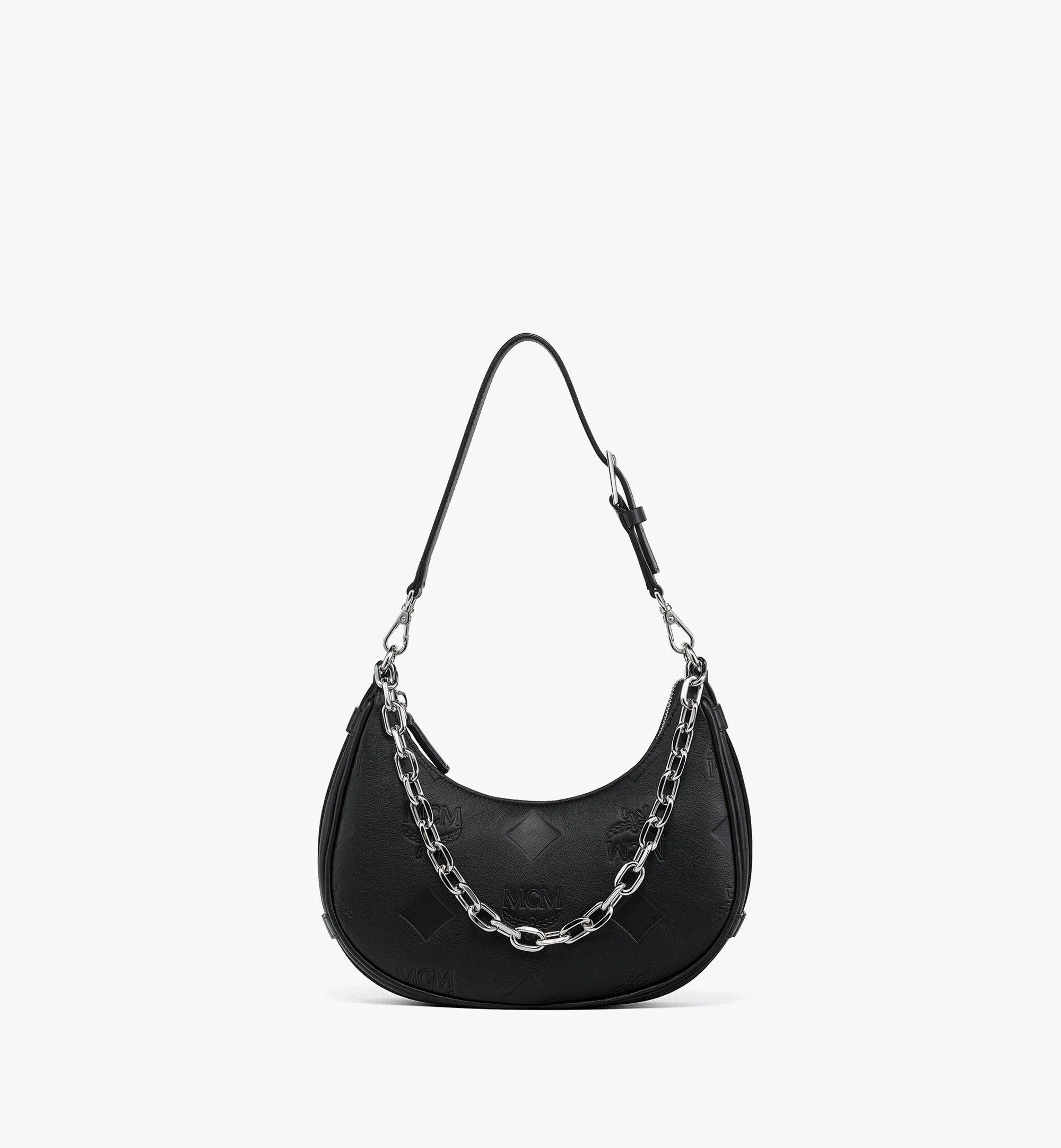 As exquisite as its lunar inspiration, this curvilinear hobo bag in Italian full-grain leather is imprinted with a maximalist interpretation of the renowned Visetos monogram. Carry by its chain handle or attach the accompanying leather strap for hands-free sophistication. - Detachable, adjustable leather strap - Chain handle - Embossed Maxi monogram motif - Zip closure - Interior slip pocket - Body: Natural full-grain leather - Silver-tone cobalt brass hardware - Microfiber lining with suede finish - Approximately 2.2 x 10.2 x 8.7 inches - 33.4" to 39.8" strap length, Handle drop: 9.8" - Made in Italy