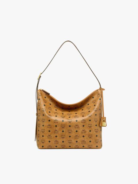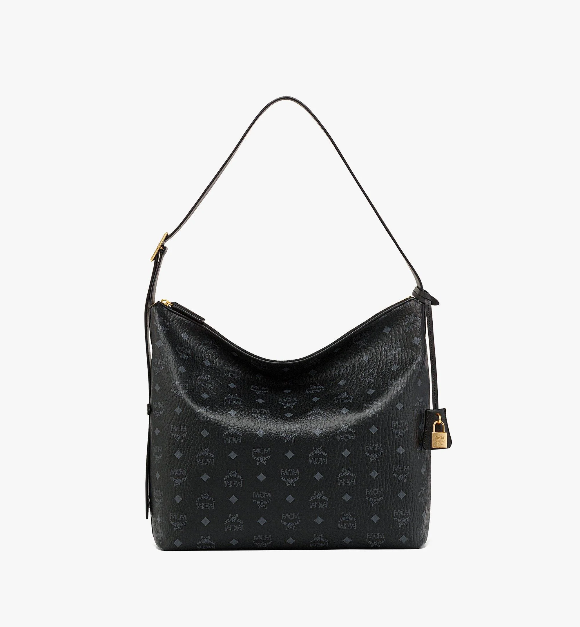 A modern interpretation of the classic slouched silhouette, featuring an ideal balance of softness and structure. The large Aren hobo bag is complemented by elements drawn from heritage MCM luggage, including a detachable leather hang tag and logo-engraved padlock. - 36.4" to 45.9" strap length - Adjustable leather shoulder strap - Detachable leather hang tag with logo-engraved padlock - Zip closure - Interior slip pocket and zip pocket - Trim: Nappa leather - Body: Visetos monogram canvas - 24k gold-plated brass hardware - Microfiber lining with suede finish - Store your item inside its protective dust bag in a cool, dry place away from direct sunlight and bright lights. Avoid continuous friction. Never clean with soap or solvent. Take care to not stain or wet the leather materials. Dry with a lint-free, light-colored absorbent cloth. - Made in South Korea Style # MWHESTA02BK001