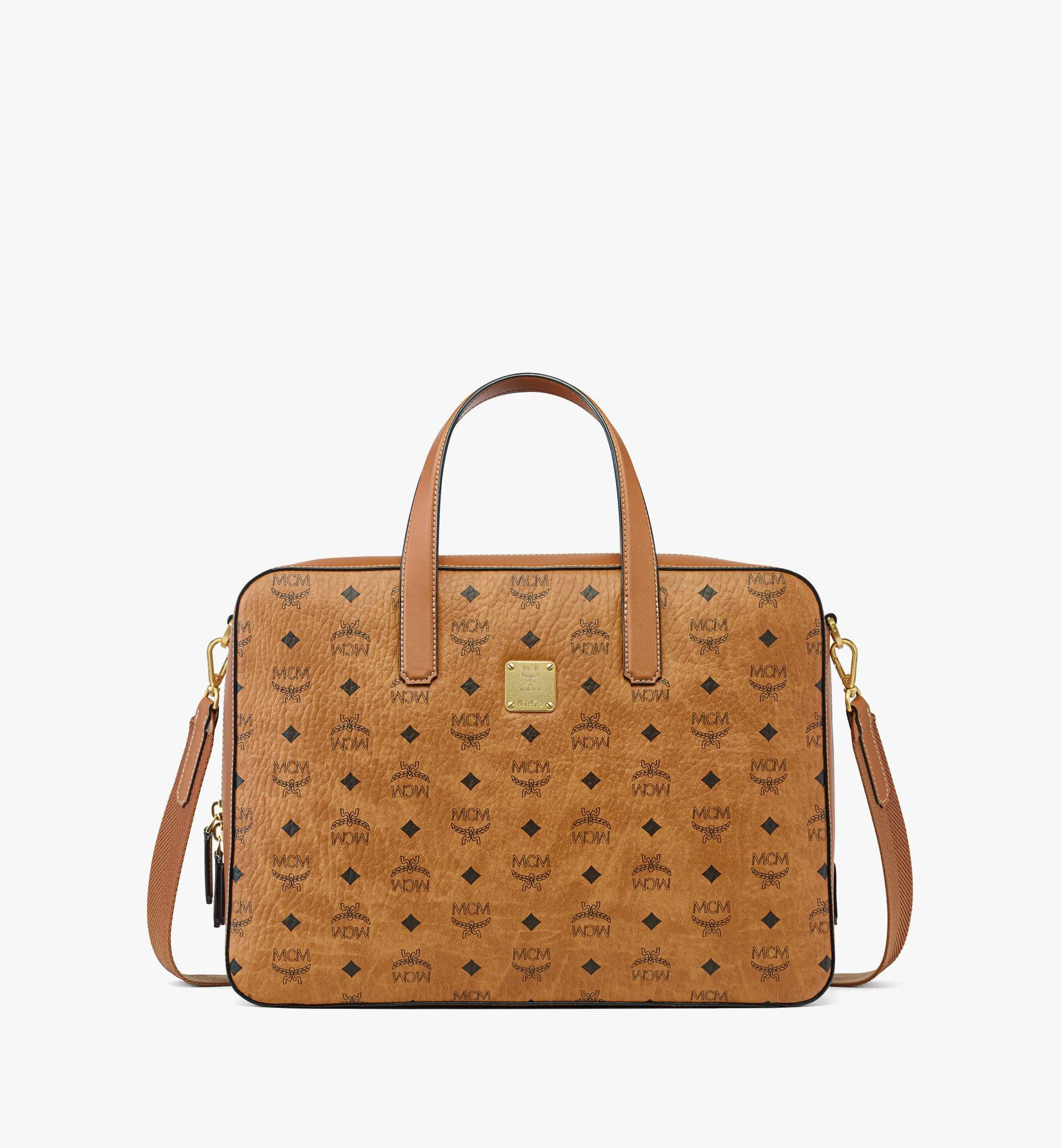 Inspired by the renowned travel luggage of the House, this large tote bag features a classic design rooted in impeccable craftsmanship. Sculpted from cognac Visetos canvas, the geometric silhouette is adorned with the signature logo brass plate and enriched by prominent leather details throughout. Carry the companion by its supple leather handles or attach the accompanying herringbone strap for effortless elegance. - Detachable, adjustable herringbone webbing strap - Leather top handles - Logo brass plate - Two-way zip closure - Interior slip pockets and zip compartment - Leather belt strap detail at back - Body: Visetos monogram canvas - Trim: Natural leather - 24k gold-plated metal hardware - Cotton lining - Approximately 3.5 x 15.2 x 11.0 inches - 47.2" to 51.6" strap, Handle drop: 5.1" - Made in Italy