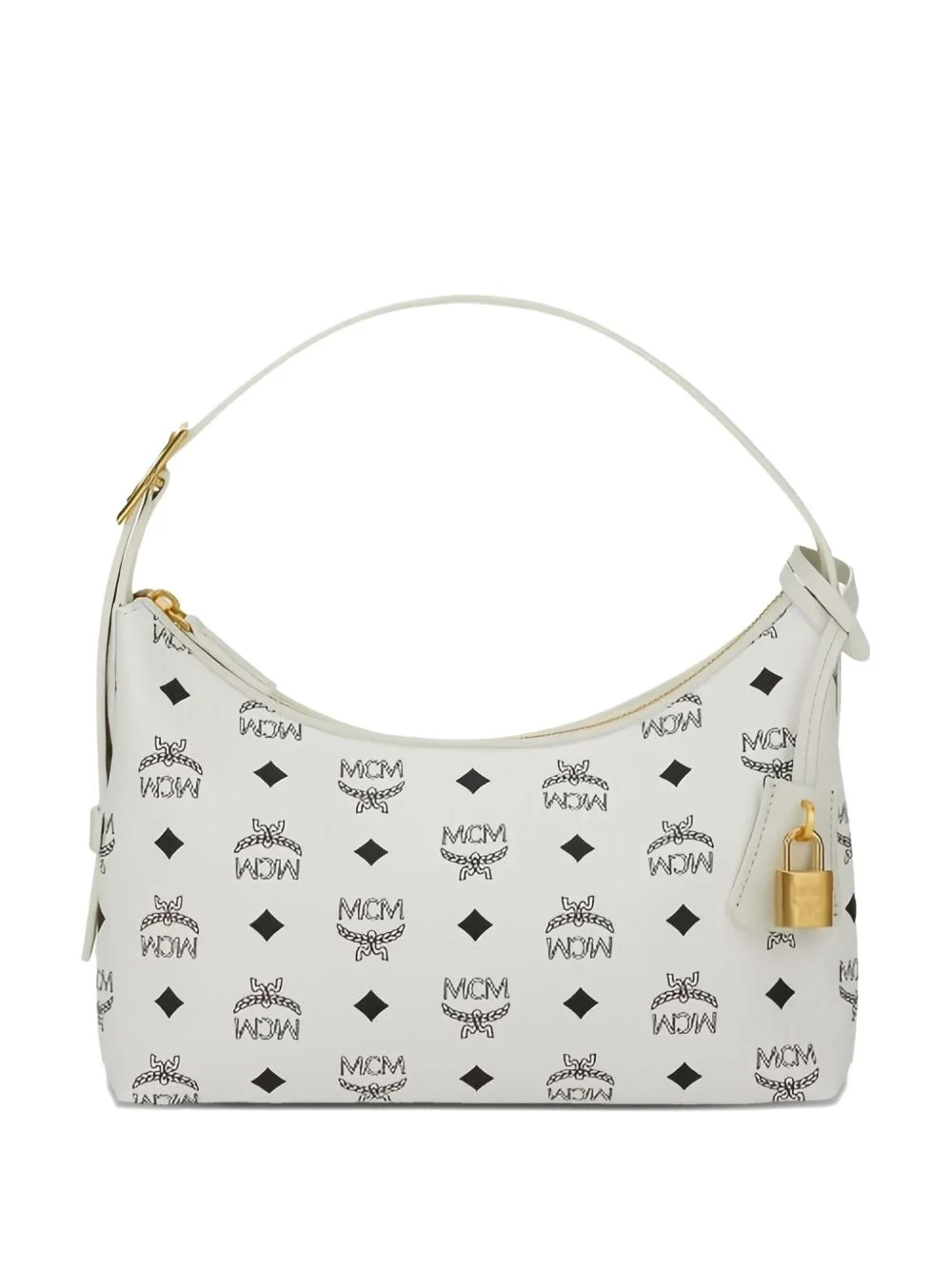 logo-print shoulder bag Highlights - White - All-over logo print - Adjustable shoulder strap - Gold-tone padlock detail - Zip top closure Imported Composition Lining: Suede 100%, Microfibre 100% Outer: Canvas 100%, Leather 100% SIZE & FIT Measurement DEPTH 3.54 in(9 cm) HEIGHT 7.48 in(19 cm) WIDTH 10.23 in(26 cm)