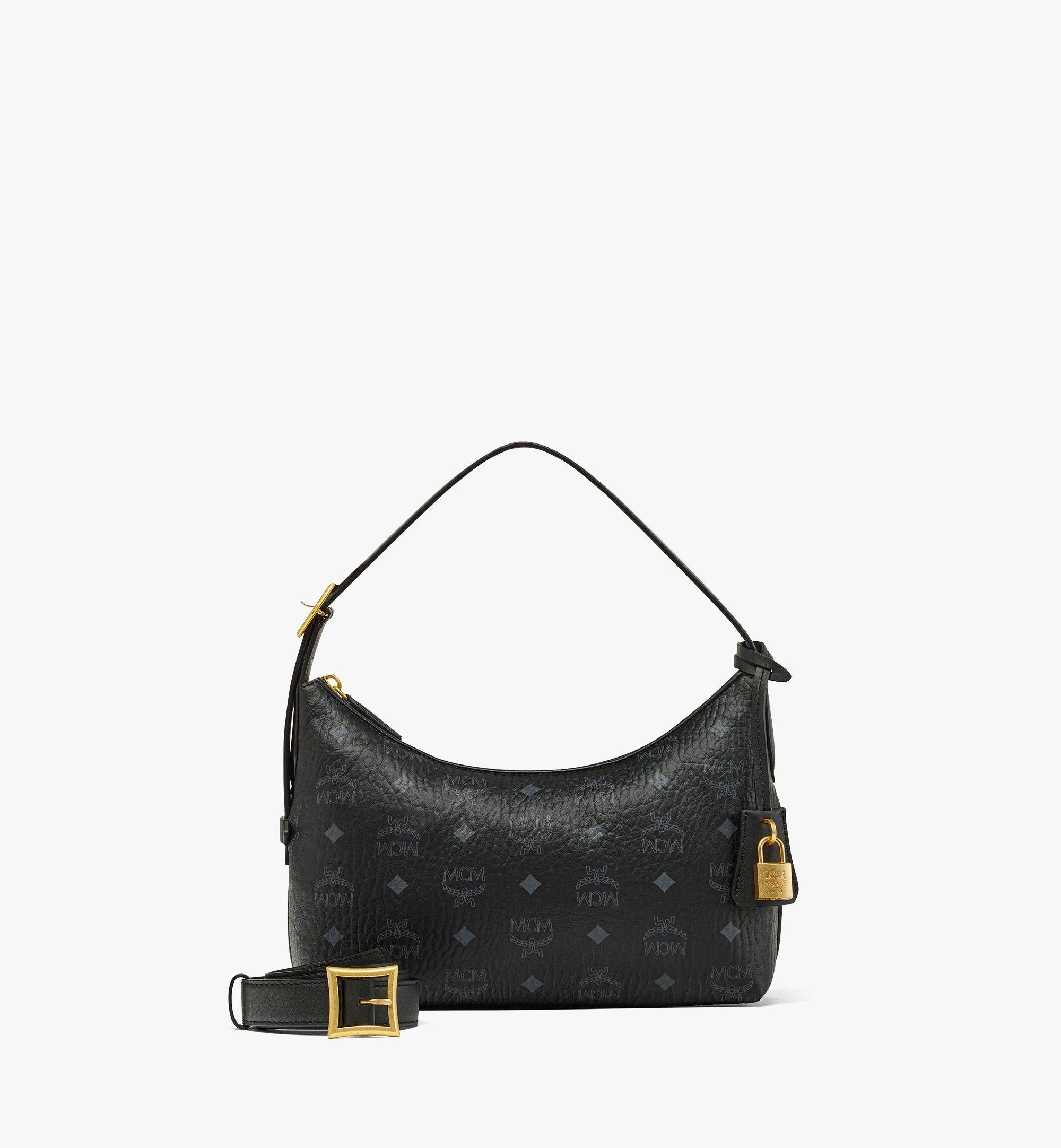 A modern interpretation of the classic slouched silhouette, featuring an ideal balance of softness and structure. The small Aren hobo bag is complemented by elements drawn from heritage MCM luggage, including a detachable leather hang tag and logo-engraved padlock. - Approximately 3.7 x 10.2 x 7.5 inches - 49.2" to 52.4" strap length - Adjustable leather shoulder strap - Detachable leather hang tag with logo-engraved padlock - Zip closure - Interior slip pocket - Logo-embossed diamond leather patch at interior - Trim: Nappa leather - Body: Visetos monogram canvas - 24k gold-plated brass hardware - Microfiber lining with suede finish - Store your item inside its protective dust bag in a cool, dry place away from direct sunlight and bright lights. Avoid continuous friction. Never clean with soap or solvent. Take care to not stain or wet the leather materials. Dry with a lint-free, light-colored absorbent cloth. - Made in South Korea Style # MWHESTA01BK001