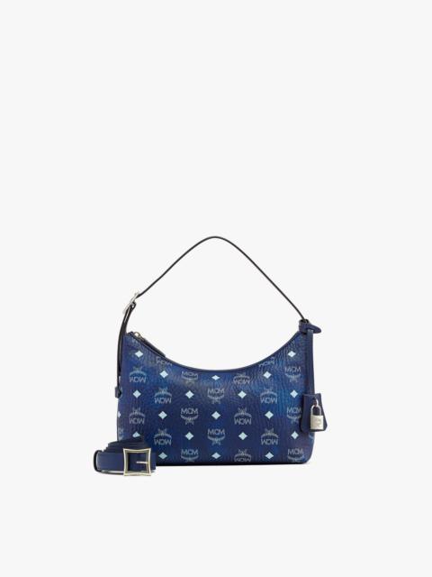 A modern interpretation of the classic slouched silhouette, featuring an ideal balance of softness and structure. Sculpted from blue Visetos canvas, the Aren hobo is complemented by elements drawn from heritage MCM luggage including a detachable leather hang tag and logo-engraved padlock. - Adjustable leather shoulder strap with crossbody extension - Detachable leather hang tag with logo-engraved padlock - Zip closure - Interior pocket - Logo-embossed diamond leather patch at interior - Body: Visetos monogram canvas - Trim: Natural nappa leather - Silver-tone cobalt metal hardware - Microfiber lining with suede finish - Approximately 3.7 x 10.2 x 7.5 inches - 49.2" to 52.4" strap length - Made in South Korea