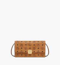 Classic elegance, joined by a true heritage hallmark. Following the Bauhaus principle of functional design, the iconic logo brass plate of the Munich House serves as a snap closure securing prized possessions inside this large monogram wallet. - Detachable leather strap - Rear exterior pocket - Logo brass plate snap closure - Interior card slots and zip compartment - Body: Visetos monogram canvas - Trim: Natural leather - 24k gold-plated brass hardware - Fabric lining - Approximately 1.4 x 7.7 x 4.1 inches - Strap drop: 21.7" - Made in South Korea