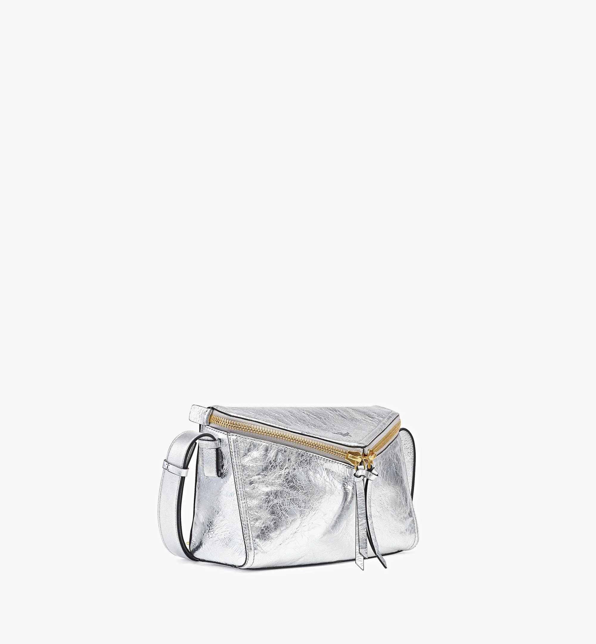 A cutting-edge incarnation of the signature Bavarian diamond — a timeless symbol of Munich and in turn, MCM. This small shoulder bag incorporates an advanced sculptural aesthetic into the classic hobo design through a distressed metallic calf leather construction. The slouched silhouette is finished with dual zip closures inspired by the sharp angles of the eponymous code. - Approximately 6.1 x 8.7 x 2.6 inches - Strap drop: 21.7” - Adjustable leather shoulder strap - Exterior pocket and zip compartment at back - Distressed effect - MCM logo motif at front - Two-way angular zip closure - Interior zip compartment - Body: Italian metallic calf leather - 24k gold-plated brass hardware - Microfiber lining with suede finish - Made in Italy Style # MWSEAAK03SV001