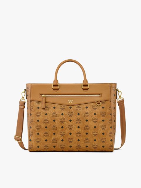 Presented in signature Visetos canvas, the front of this large east-west tote features a geometric leather design inspired by the Bavarian diamonds of Munich. A robust zip closure secures the silhouette, featuring a vast cotton twill interior with three pockets and space for a 16” laptop. - Detachable, adjustable fabric crossbody strap - Leather top handles - Front zip pocket - Laurel logo motif at front - Zip closure - Two interior slip pockets - Interior zip compartment - Fits 16” MacBook Pro - Body: Visetos monogram canvas - Trim: Natural leather - 24k gold-plated brass hardware - Cotton twill lining - Approximately 5.3 x 15.0 x 12.6 inches - 29.9" to 53.5" strap length, Handle drop: 4.3" - Made in South Korea