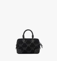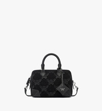 Jacquard-woven with the Lauretos monogram in metallic silver lurex yarn, the small Ella Boston bag features a timeless silhouette inspired by travel trunks from the Golden Age of Munich. A renowned insignia of our German birthplace, the Bavarian diamond informs the geometric design of the accompanying leather charm. - Removable, adjustable leather strap - Leather top handles - Detachable Bavarian diamond leather charm - Two-way zip closure - Interior slip pocket with leather patch - Leather-covered corners - Body: Lauretos monogram lurex jacquard - Trim: Natural leather - Silver-tone cobalt metal hardware - Microfiber lining with suede finish - Approximately 4.7 x 8.5 x 5.7 inches - 45.3" to 52.8" strap length, Handle drop: 3.1" - Made in South Korea