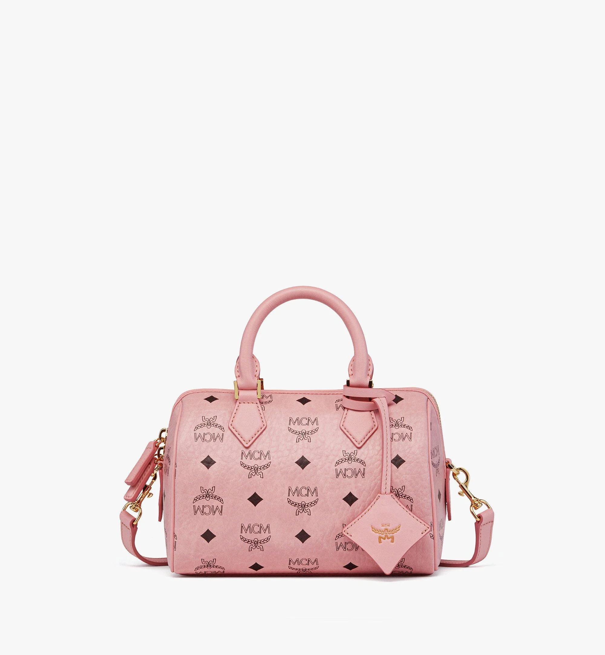 Born from the Golden Age of Munich, the Ella Boston bag is an elegant homage to travel trunks of that famed period in German history. An accompanying logo-embossed leather charm — modeled after the Bavarian diamonds — further nods to the birthplace of the House. - Removable, adjustable leather crossbody strap - Leather top handles - Detachable logo-embossed Bavarian diamond leather charm - Two-way zip closure - Interior pocket - Body: Visetos monogram canvas - Trim: Natural leather - 18k gold-plated metal hardware - Microfiber lining with suede finish - Approximately 4.7 x 8.7 x 5.7 inches - 45.3" to 52.8" strap length, Handle drop: 3.1" - Made in South Korea