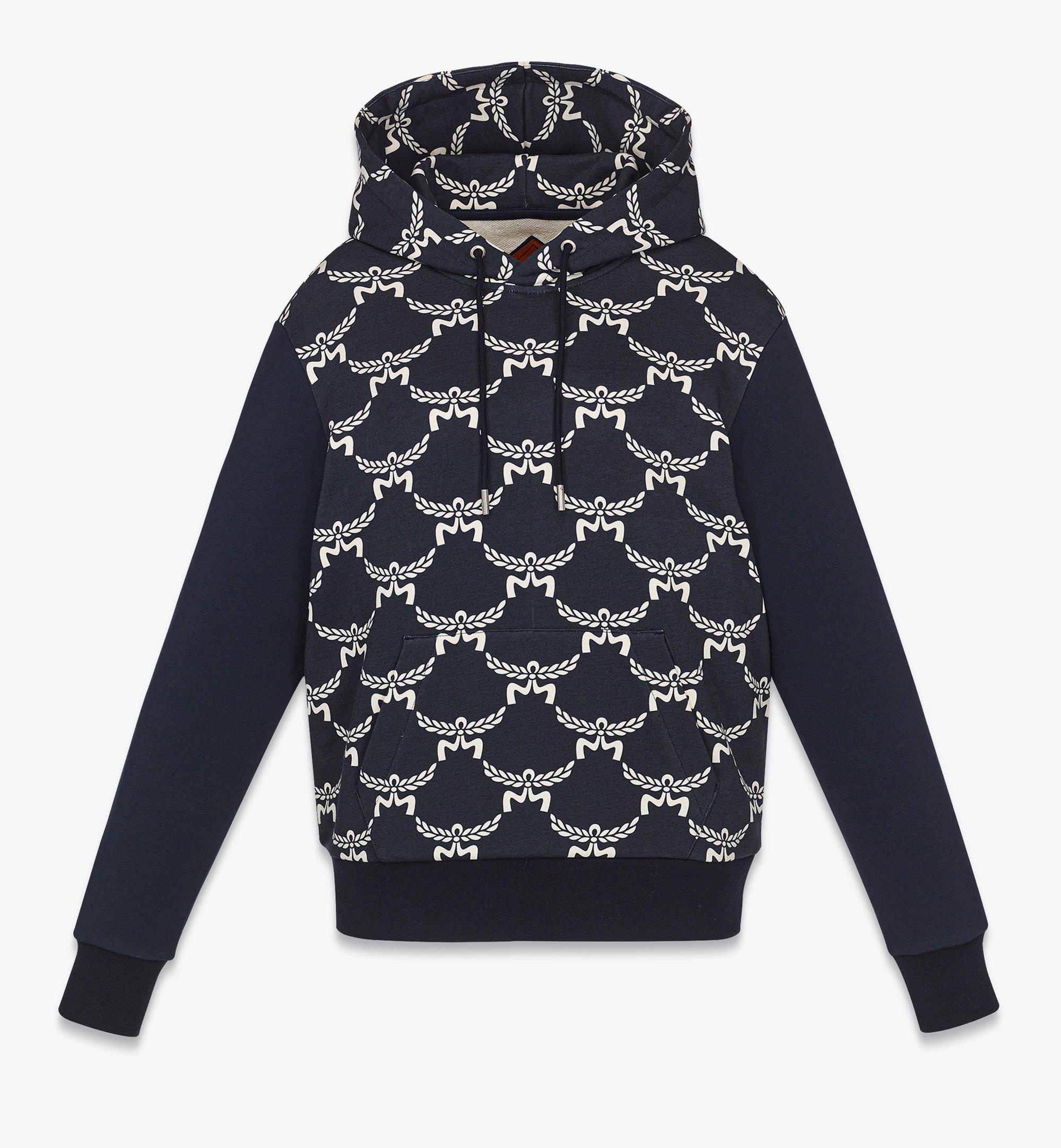 A noble garland emblematic of MCM, the signature laurels crown this organic cotton hoodie through the Lauretos monogram print in a contrasting colorway. Rib knit accents complete this elevated wardrobe staple. - Adjustable drawstring hood with logo-engraved metal tips - Lauretos monogram digital print - Front kangaroo pocket - 100% GOTS-Certified Organic Cotton - Regular fit - Dry clean. Do not bleach or tumble dry. - Made in South Korea Style # MFAEAMM02VC00S