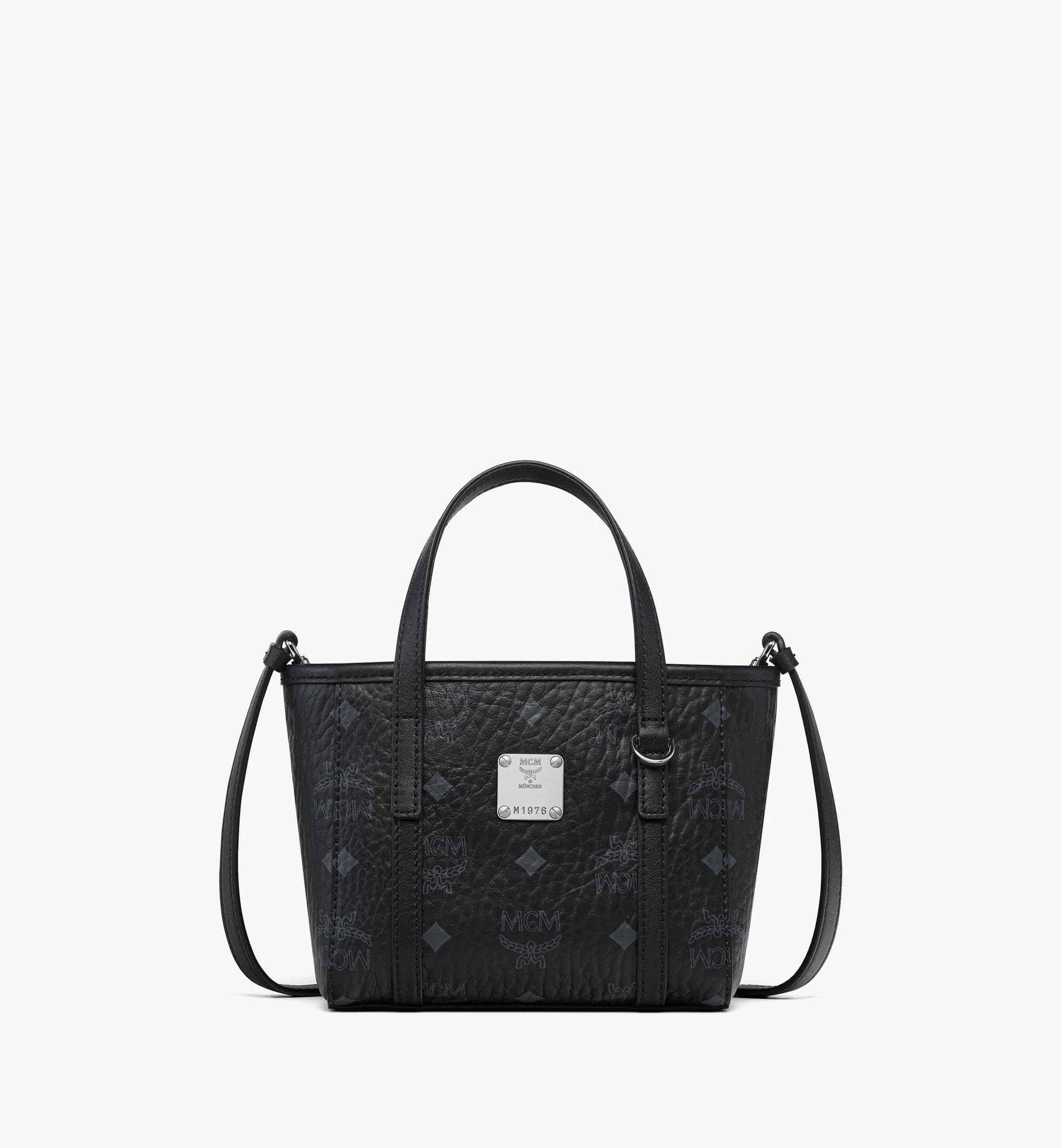 The distinctive geometric design of the Toni shopper is scaled down to craft this perfectly petite companion. Supple leather handles and an adjustable leather strap allow for two modes of carriage. - Detachable, adjustable leather strap - Leather top handles - Logo brass plate - Rear exterior pocket - Top-zip closure - Interior pocket and card slots - Body: Visetos monogram canvas - Trim: Natural nappa leather - Silver-tone cobalt metal hardware - Fabric lining - Approximately 3.5 x 6.3 x 5.5 inches - 43.1" to 52.6" strap length, Handle drop: 3.5" - Made in South Korea