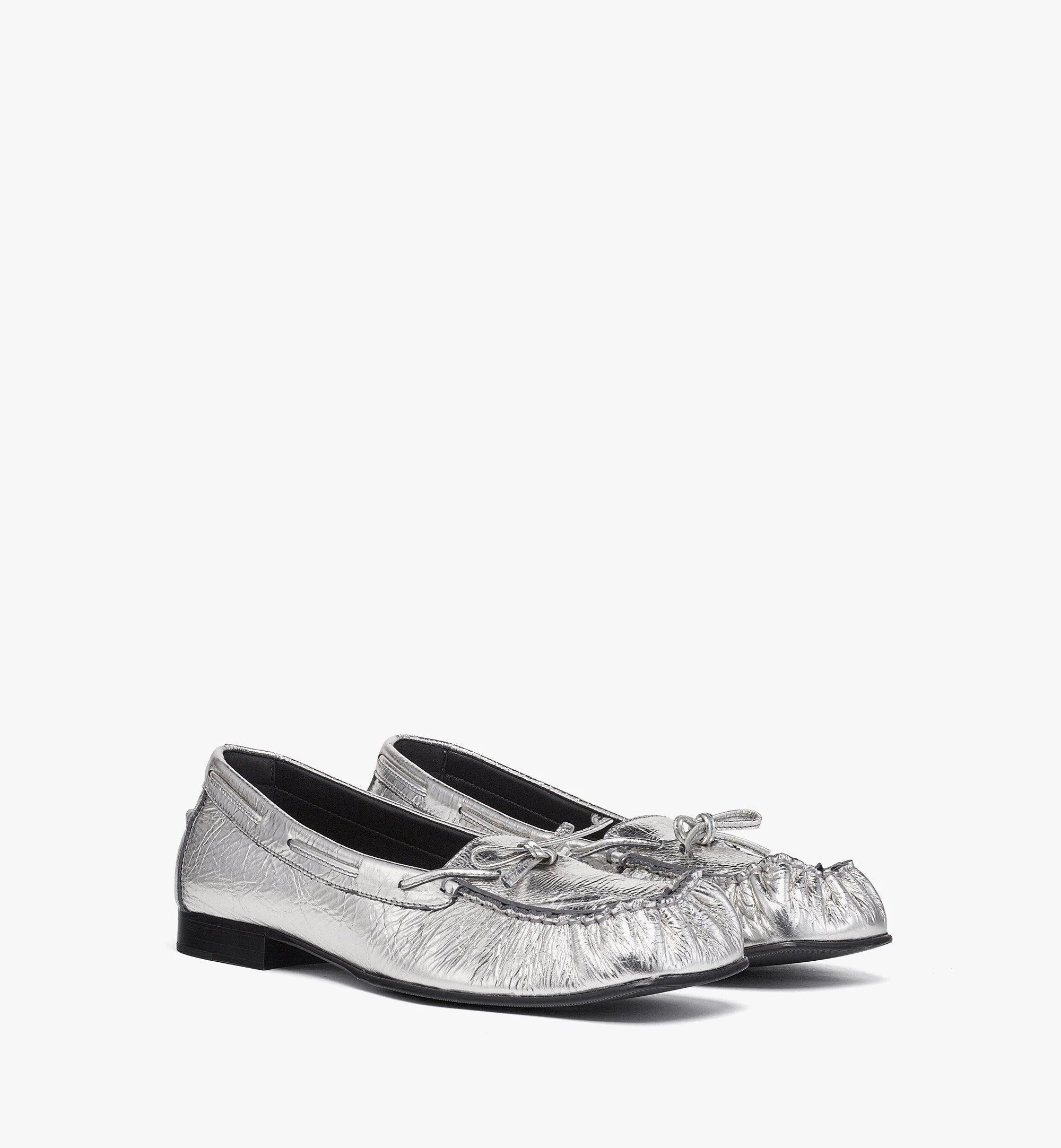 An ultramodern iteration of the classic moccasin. Fashioned from Italian metallic calf leather, the season’s moccasin features a distressed effect for a distinctively advanced aesthetic. A sumptuous leather sole and decorative leather laces complete the novel design. - Decorative leather lace fastening - Distressed effect - Body: 100% Metallic Calf Leather - Outsole: 100% Leather - Lining: 100% Lamb Leather - Made in Italy
