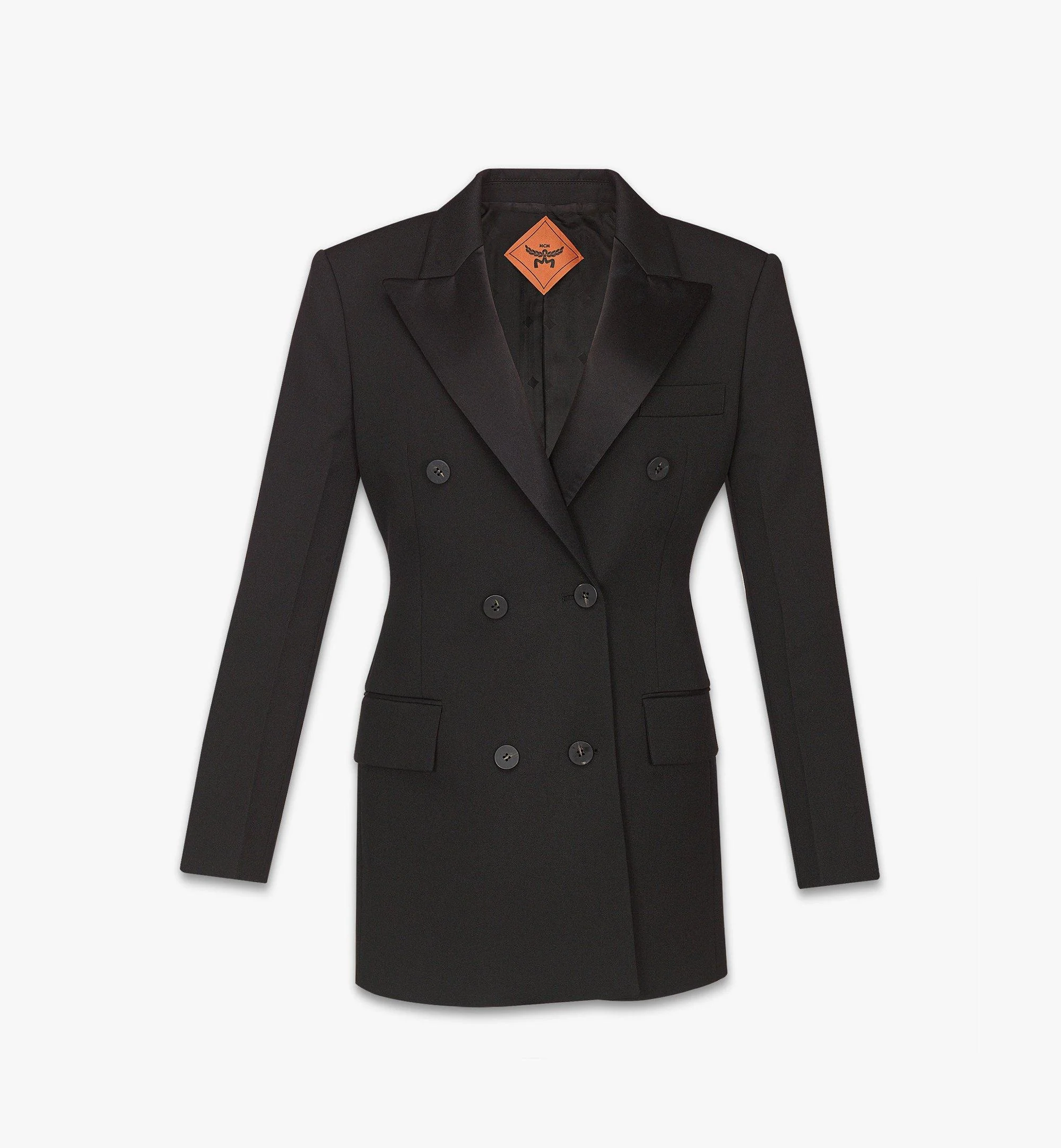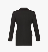 Woven from fine Japanese wool, this double-breasted jacket is augmented with silk satin peak lapels. Exaggerated shoulders and a tapered waist imbue the silhouette with feminine sophistication. - Double-breasted - Peak lapels in silk satin - Power shoulders - Button closure - Welt pocket at chest - Front flap pockets - 100% Wool - Regular fit - Dry clean only. Do not bleach or tumble dry. - Made in South Korea Style # MFJESMM06BK038