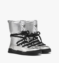 Boasting a padded chiffon upper, these metallic silver boots reinterpret the classic cozy winter silhouette through a sporty design. The pair features a distressed finish, punctuated by a crushed calfskin leather composition. - Lace fastening - Embroidered logo patch at collar - Skyward rubber outsole with MCM logo motif - Leather patch with logo print on footbed - Upper: Padded polyester chiffon - Trim: Crushed metallic calf leather - Brushed knit lining - Made in Italy
