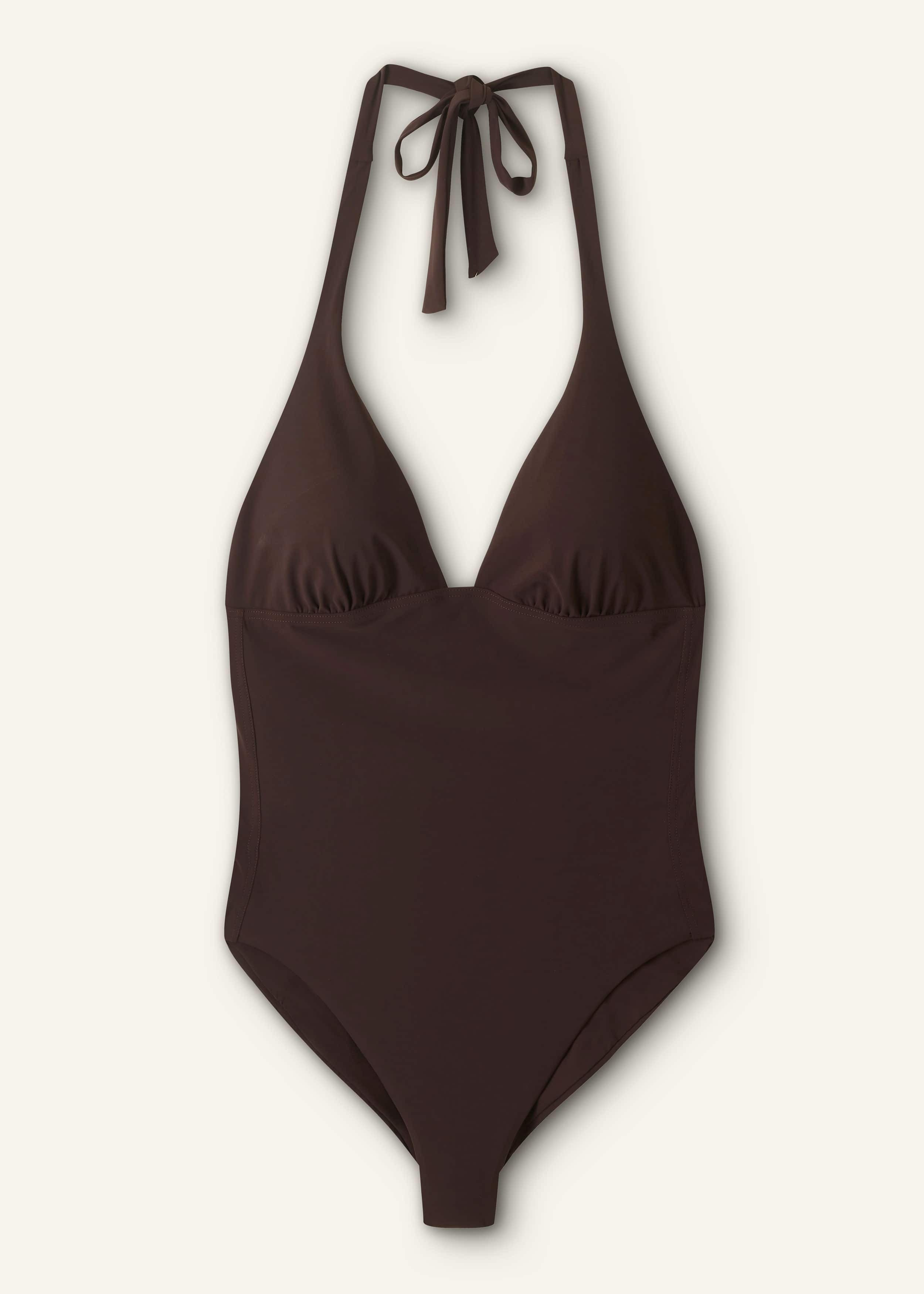 Signing off your edit of beachwear essentials, this halterneck swimsuit is the perfect addition to your vacation suitcase. In a chocolate brown hue, this one-piece is intelligently designed with FIT Halter shape with tie fastening Removable bust cups Low scoop back Adjustable rise Medium coverage Lined front and back Complimentary reusable bag MODEL WEARS Model is a US size 4, wearing a US size 4Model height is 5ft 8in / 173cm COMPOSITION Main : 75% Polyamide, 25% Elastane Lining : 73% Polyamide, 27% Elastane This Italian easy-care and quick-drying fabric has a four-way stretch to offer ultimate fit and comfort. The construction of the fabric offers UV protection qualities and it doesn't wrinkle or pill, whilst the thicker cut of the fabric creates a sculpting effect for a flattering finish.