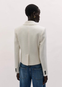 The ultimate investment that works overtime to meet the needs of the day, then transitions seamlessly into a nighttime hero, this blazer is a must-have this winter season. It’s made from a soft yet structured Italian wool blend, and the sculpted, fitted shape is designed to contour the body for a naturally flattering silhouette. FIT Long sleeves Functional front buttons Fitted Slim fit Short length MODEL WEARS Model is a UK size 8, wearing a UK size 8 Model height is 5'10'' / 177cm Fits true to size COMPOSITION Main Fabric: 57% Polyester, 35% Wool, 8% Polyacrylic Lining: 100% Recycled Polyester Contrast Fabric: 50% Cotton, 50% Acrylic Crafted from an Italian wool blend fabric, which has a soft yet structured feel with a textured surface.
