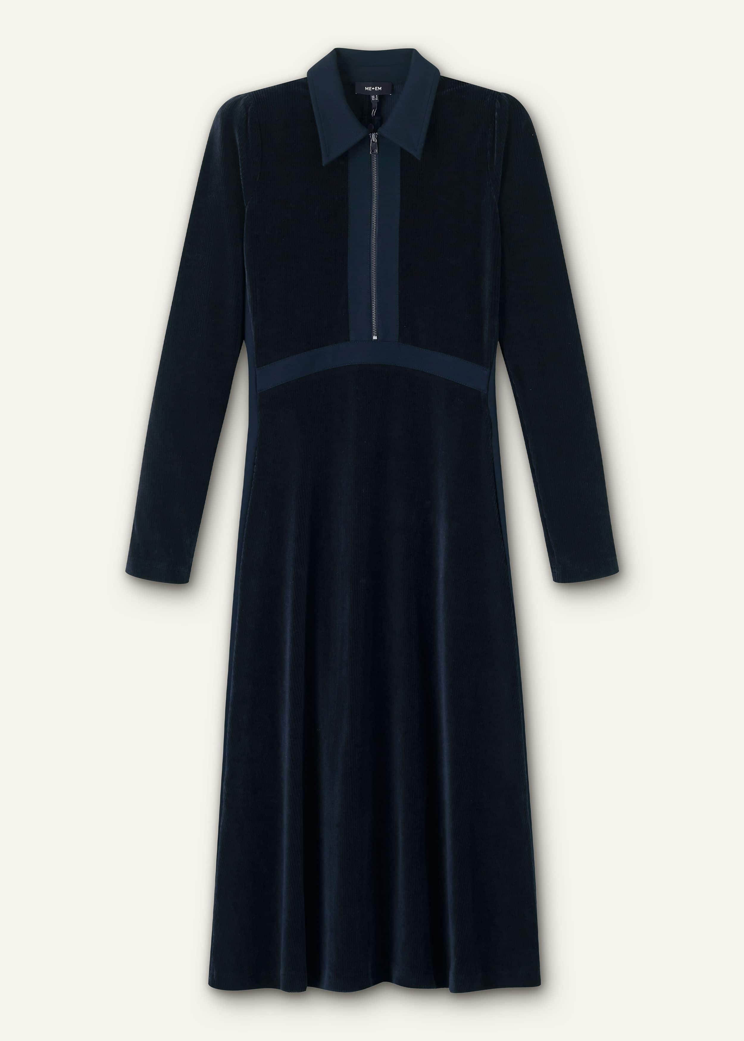 The ultimate AM-PM staple, this dress is made from stretch-infused cotton-blend corduroy jersey with a velvety handfeel for just the right amount of comfort and polish. Contrasting panels of smooth ponte outline the waistband, zip neckline and collar for a flattering texture contrast. FIT Fit and flare shape Shirt collar with zip fastening Full-length sleeves Level hem Midi length MODEL WEARS Model is a US size 4, wearing a US size 4 Model height is 5'10” / 178cm Fits true to size COMPOSITION 62% Cotton, 32% Polyester, 6% Elastane Crafted from stretch-infused cotton-blend corduroy jersey with a velvety handfeel and a flattering natural drape. This piece has contrast panels of smooth ponte.