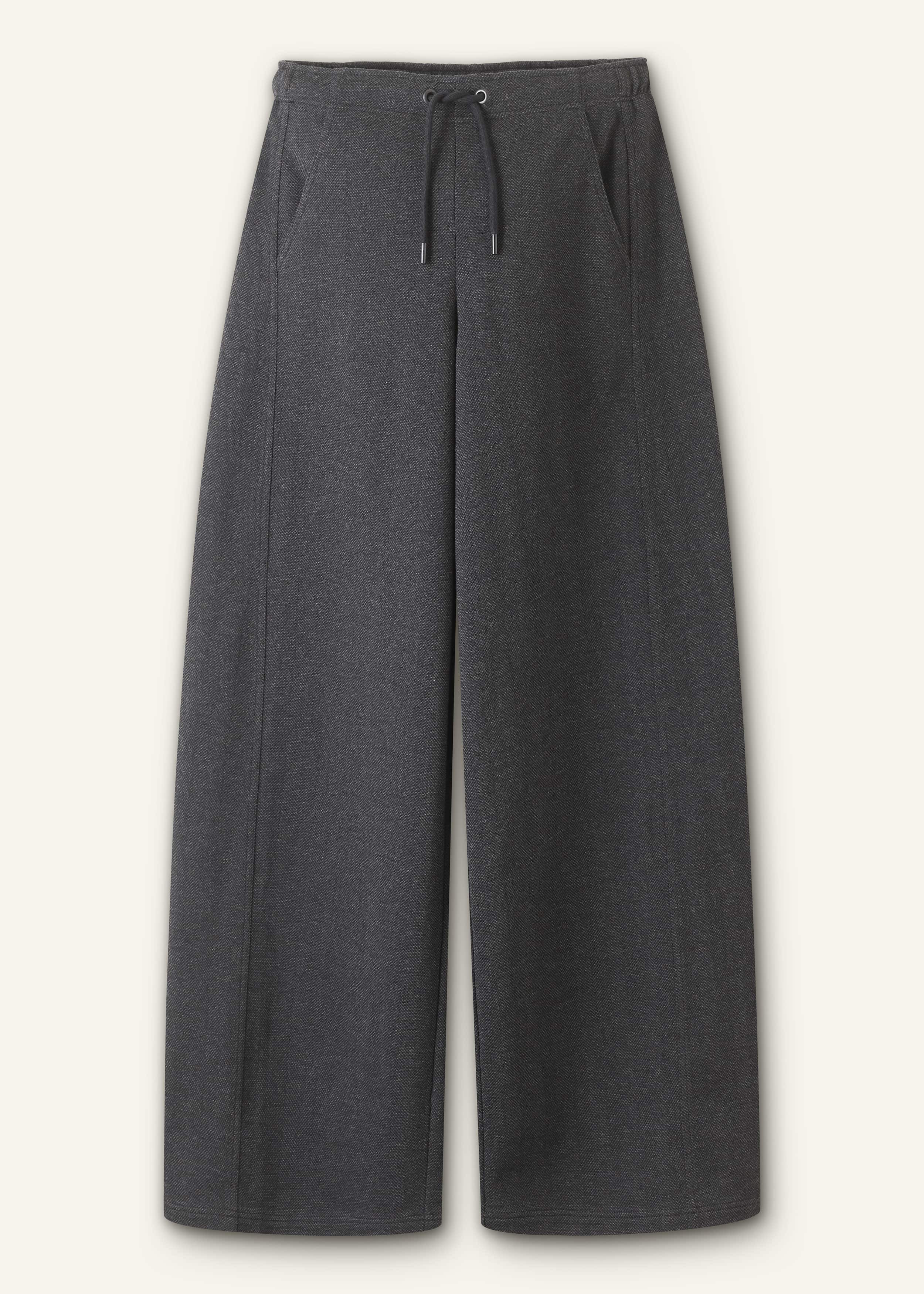 The ultimate union of classic + contemporary style, this barrel-leg pant is designed with a straight fit through the hips to ensure a naturally flattering flare into the curved leg. It’s made from herringbone jersey that combines the softness and comfort of jersey with the look of classic tailoring. FIT Mid rise Pull-on style with drawstring tie Wide barrel-leg shape Side pockets Full length MODEL WEARS Model is a US size 4, wearing US size 4 Model height is 5'10.5” / 179cm Fits true to size COMPOSITION 42% Cotton, 33% Polyester, 17% Viscose, 7% Polyamide, 1% Elastane Crafted from mid-weight herringbone jersey that combines the softness and comfort of jersey with the look of classic tailoring. This fabric has added stretch and a soft handfeel.
