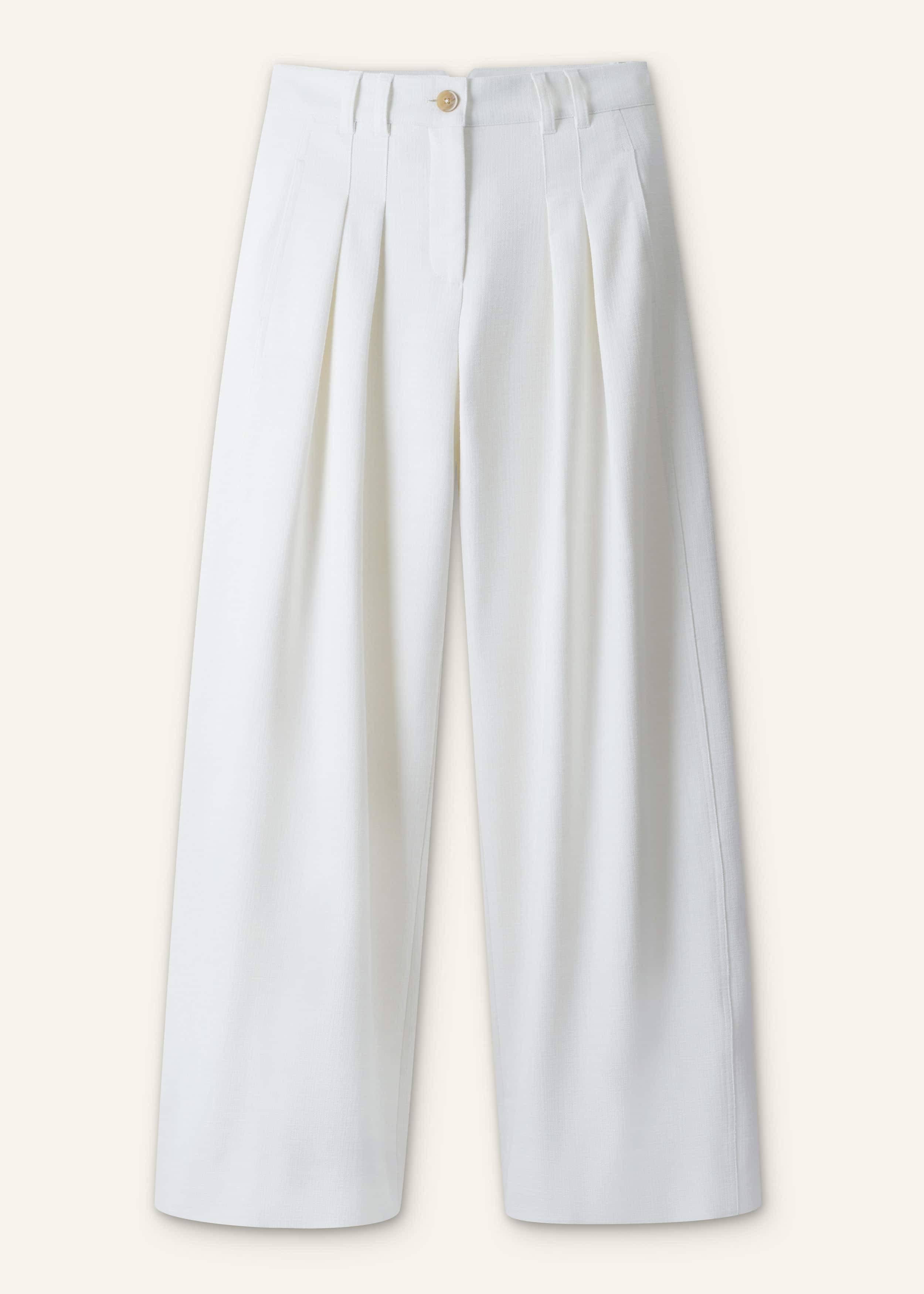 Available in two different lengths, this is a white pant you can rely on. This pair is cleverly crafted from a fluid tailoring fabric with a thicker, textured surface, ensuring it isn’t see-through. The wide hems work to narrow the waist and elongate the frame, whilst the double pleats add volume through the leg. FIT Wide leg Full length Mid rise Double pleats Functional pockets Button + zip fastening Available in two different lengths MODEL WEARS Model is a US size 4, wearing a size 4 Model height is 5'10"" / 178cm Fits true to size COMPOSITION Main Fabric: 71% Recycled Polyester, 27% Viscose, 2% Elastane Contrast Fabric: 97% Cotton, 3% Elastane Lining: 100% Viscose Crafted from Portuguese tailoring fabric with a soft yet structured feel and a textured surface.