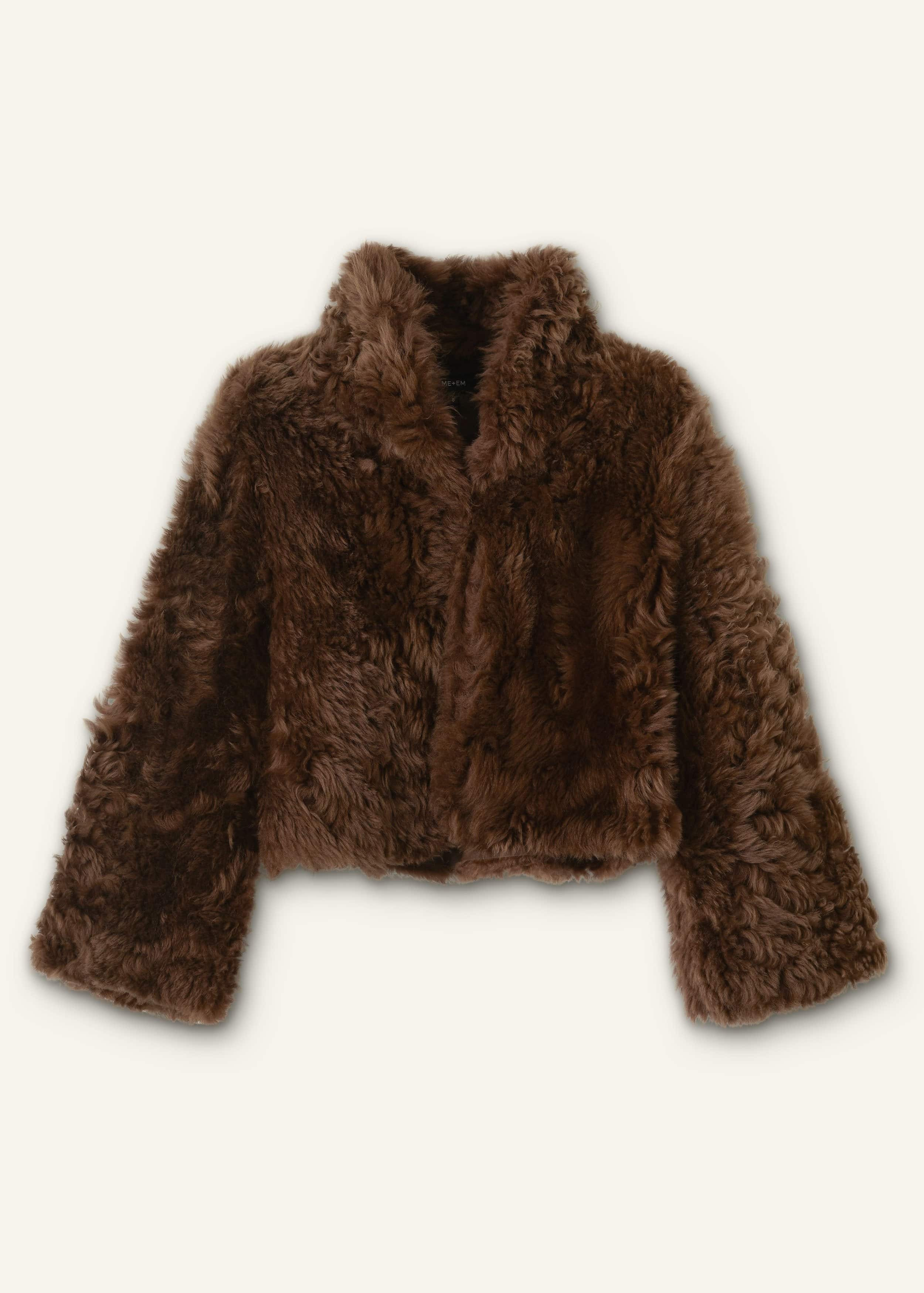 Our signature shearling is a forever investment. Refreshed for the new season in a Chestnut brown hue, this jacket has a cropped length, grown-on neckline and a hook-and-eye fastening for a secure closure over dresses and tailoring. FIT Grown-on neckline Straight fit Short length Long sleeves Hook and eye fastening MODEL WEARS Model is a US size 4, wearing a size S Model height is 5'10” / 178cm Fits true to size COMPOSITION 100% Sheepskin Crafted in the UK from by-product shearling. All our leather and shearling is a by-product of the food industry.