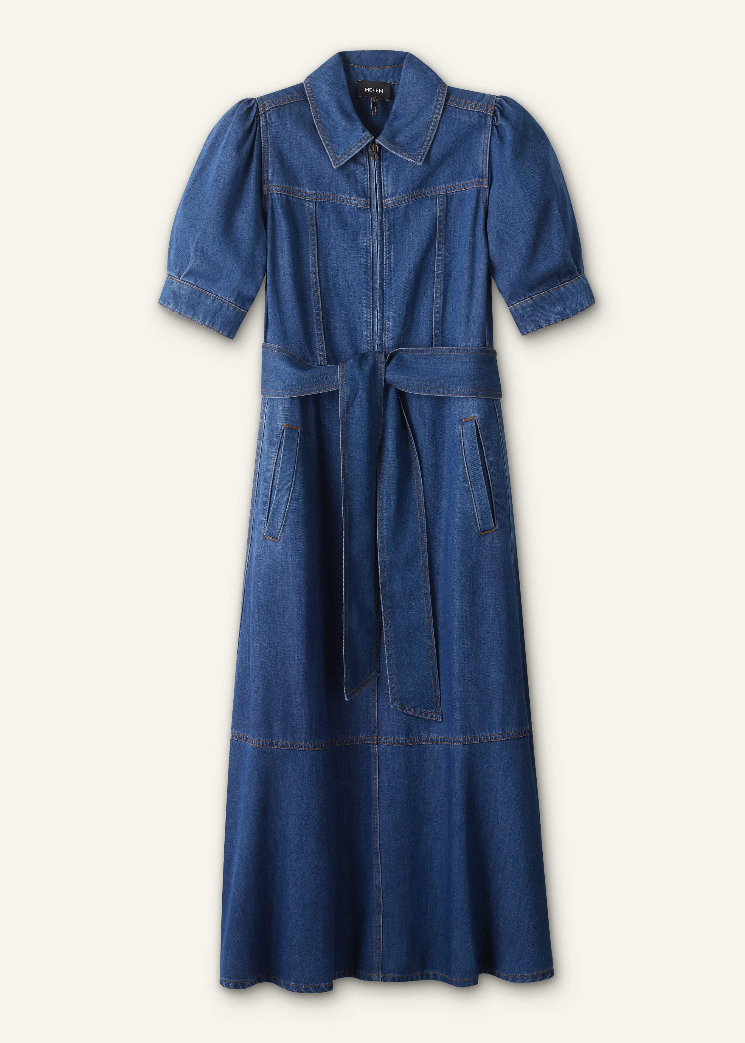 Granting off-duty denim a fluid, comfortable edge, this dress is crafted from a lightweight viscose-blend in a mid-blue wash with contrast stitch detailing, highlighting the fit and flare shape. Add mileage to your final look with the matching tie belt. FIT Fit + flare shape Midi length Front zip fastening Optional belt Short sleeves Functional pockets MODEL WEARS Model is a US size 4, wearing a US size 4 Model height is 5'8"" / 173cm Fits true to size COMPOSITION Main Fabric: 83% Viscose, 17% Polyester Pocket Lining: 65% Polyester, 35% Cotton Crafted from lightweight and fluid cotton denim that has natural movement.