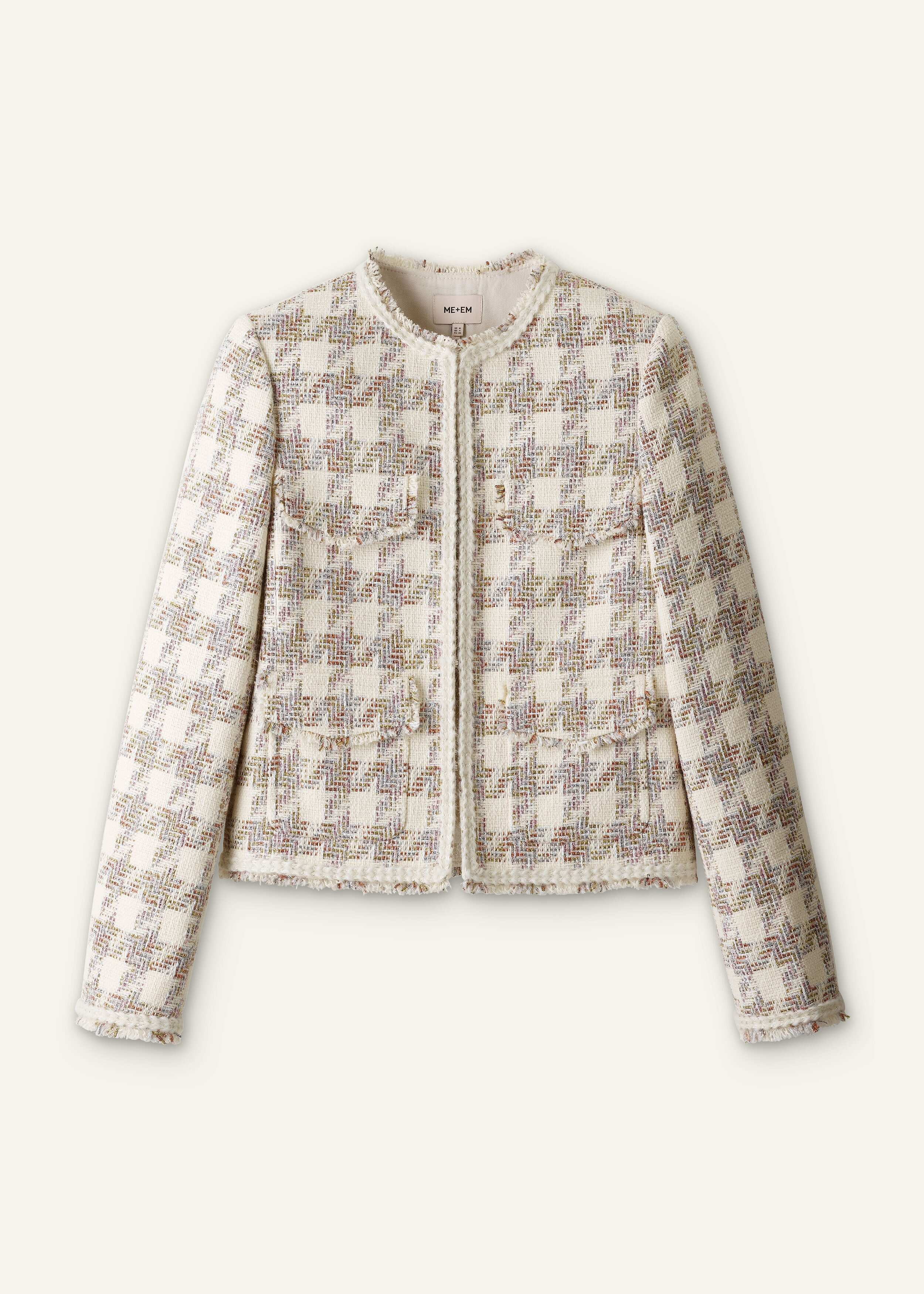 The latest Heritage Jacket to join our line-up, this piece is meticulously crafted in collaboration with British tweed makers Linton Tweeds, woven in a classic houndstooth pattern with a subtle metallic sheen for a 24kt luxe lift. It’s interwoven with four different colored threads for versatile jewellery and accessory pairings, elevated with braided fringe trims, a hidden hook-and-eye closure for a clean finish and a tonal satin lining for a smooth feel against the skin. FIT Straight fit Short length Long sleeves Centre front hook-and-eye fastening Functional front pockets Contrast trim detail MODEL WEARS Model is a US size 4, wearing a US size 4 Model height is 5'10"" / 178cm Fits true to size COMPOSITION Main Fabric: 46% Cotton, 19% Wool, 19% Polyamide, 8% Viscose, 7% Metallised Fibres, 1% Polyester Body Lining: 100% Viscose Contrast Fabric: 100% Cotton Crafted from bespoke British tweed in collaboration with heritage tweed makers Linton Tweeds. This fabric has a textured, woven surface and a houndstooth pattern that features different tones of metallic thread.