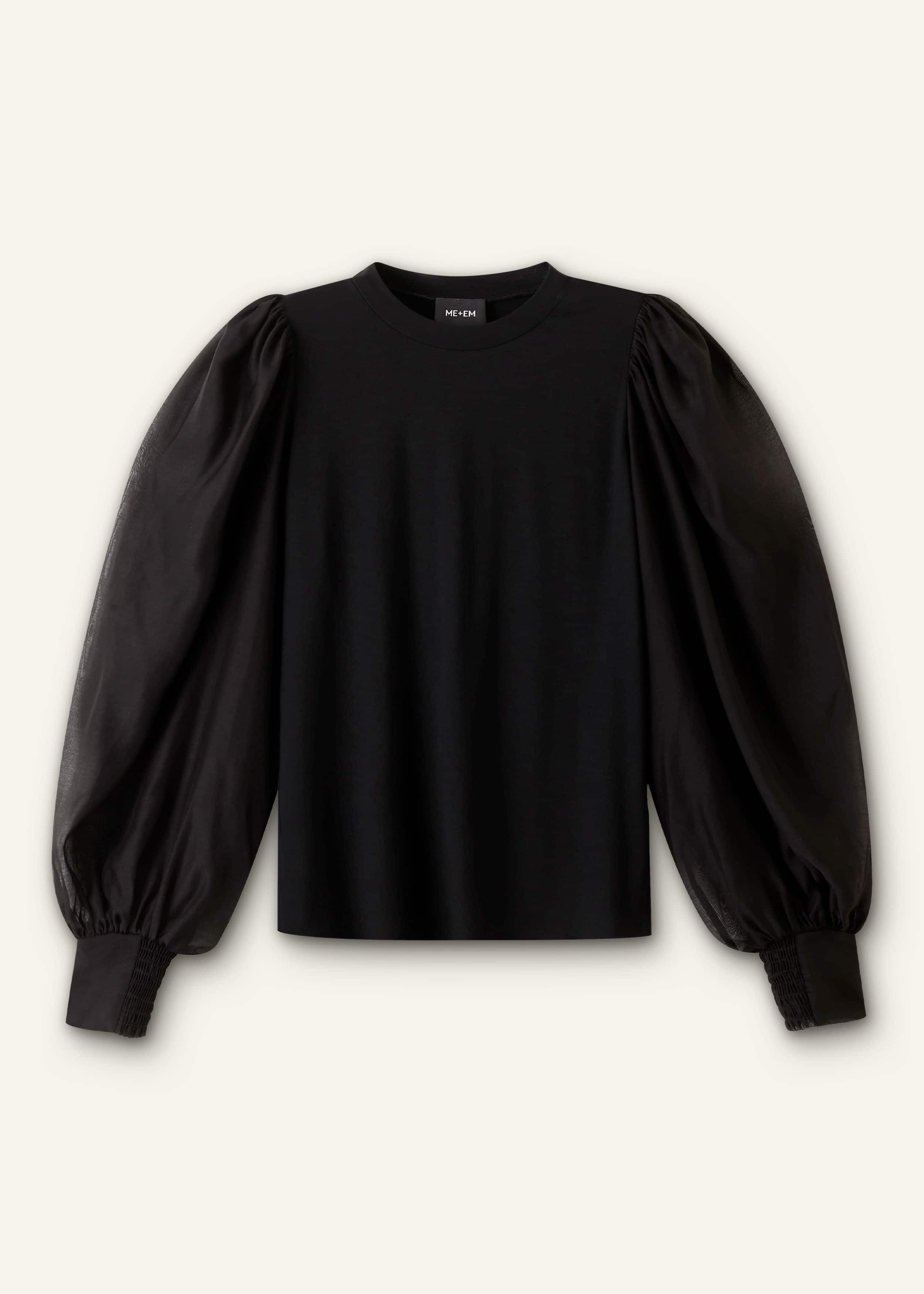 Characterised by bold balloon sleeves, this top is made from stretch-infused viscose jersey at the body and contrasting silk-blend organza through the sleeves for a flattering mixed-media finish. Its shape is designed to sit seamlessly under our knitted vests for a bulk-free layered look. FIT Slim fit Crew neckline Full-length balloon sleeves Half-shirred cuffs Level hem MODEL WEARS Model is a US size 4, wearing a US size 4 Model height is 5'10.5” / 179cm Fits true to size COMPOSITION 95% Viscose, 5% Elastane Crafted with a soft stretch-infused viscose jersey body and contrasting silk-blend organza sleeves.