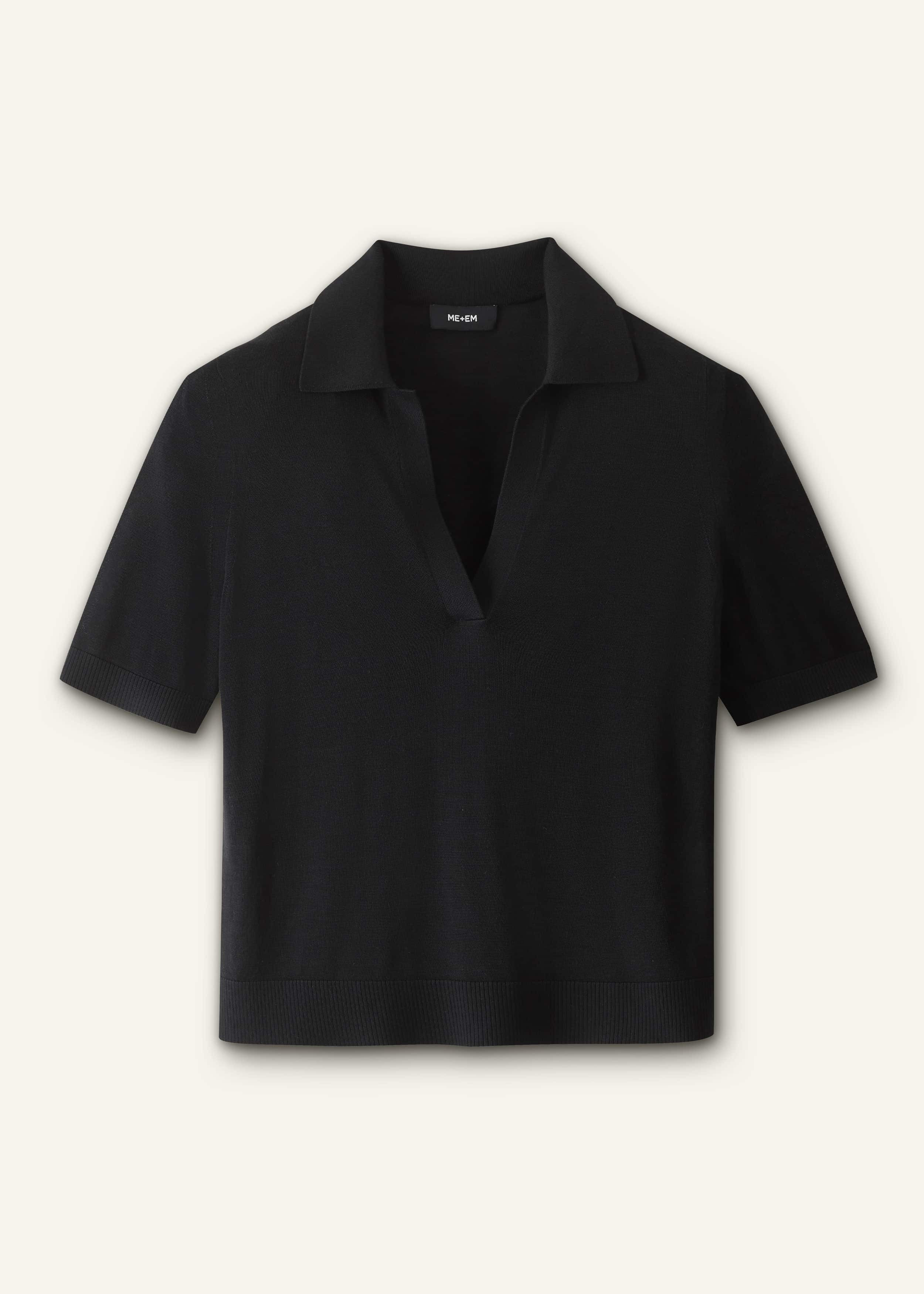 This tee is made from pure silk yarn, knitted in a plain jersey stitch for a supersoft feel and a slinky, semi-sheer finish. The ribbed trims and flattering V-neckline ensure a sleek, slim fit when it’s layered. FIT Slim fit Open polo neckline Set-in armhole positioning T-shirt length sleeves Standard body length Level hem MODEL WEARS Model is a US size 4, wearing a size S Model height is 5’11” / 180cm Fits true to size COMPOSITION 100% Silk Crafted from pure silk yarn that’s knitted in a plain jersey stitch for a supersoft, slinky hand feel and a naturally breathable finish.