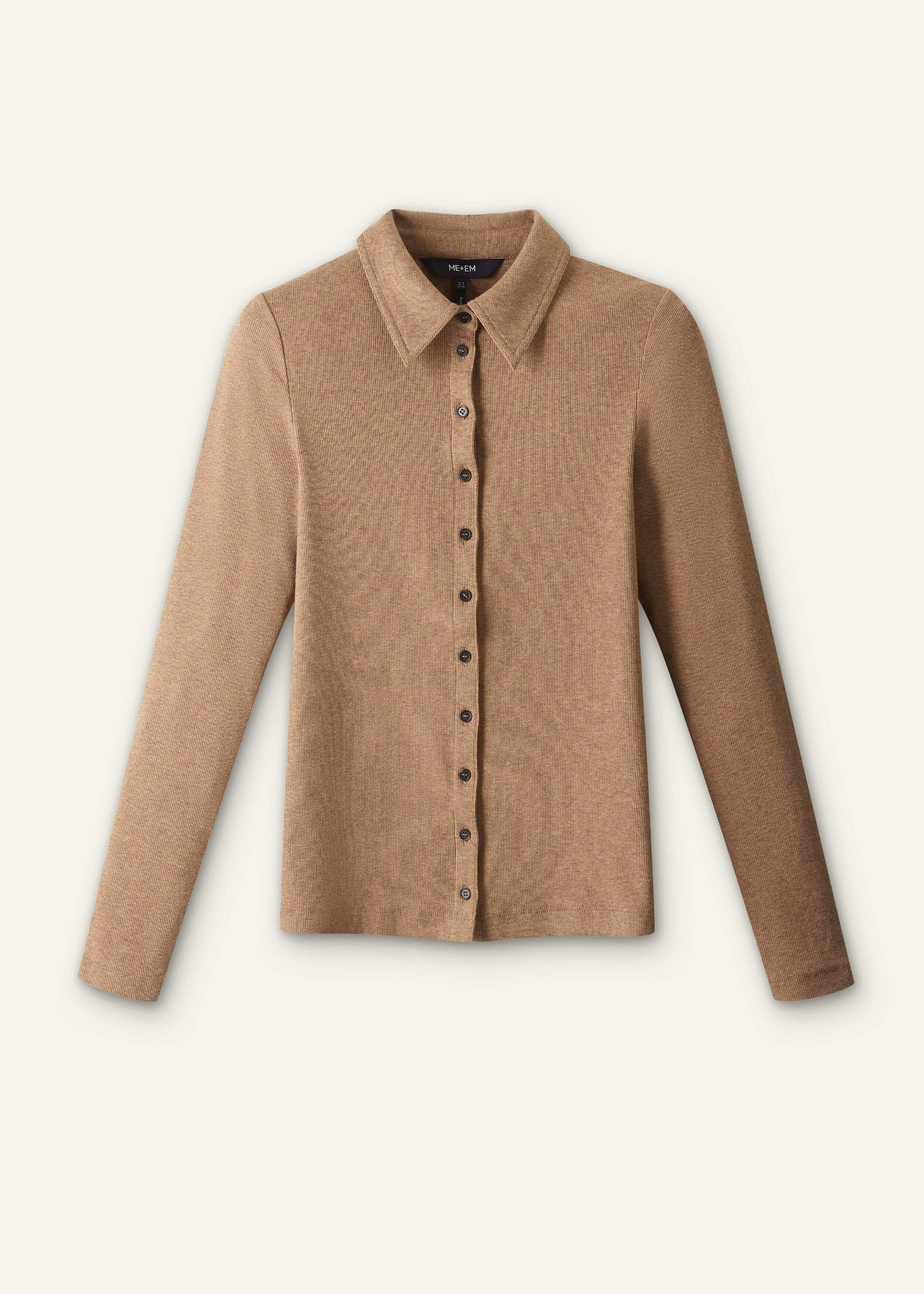 A softer take on a tailoring staple, this shirt is crafted from cotton-rib jersey infused with stretch for maximum comfort and a slim fit. The button-down front allows it to be worn alone or unbuttoned over the coordinating Perfect Basic Tank for a cohesive layered finish. FIT Slim fit Shirt neckline with button-up closure Full-length sleeves Level hem MODEL WEARS Model is a US size 4, wearing a US size 4 Model height is 5'10.5” / 179cm For a more relaxed fit, we recommend taking the next size up from your usual size COMPOSITION 95% Cotton, 5% Elastane Crafted from lightweight cotton-rib jersey infused with stretch for maximum comfort and a slim fit.