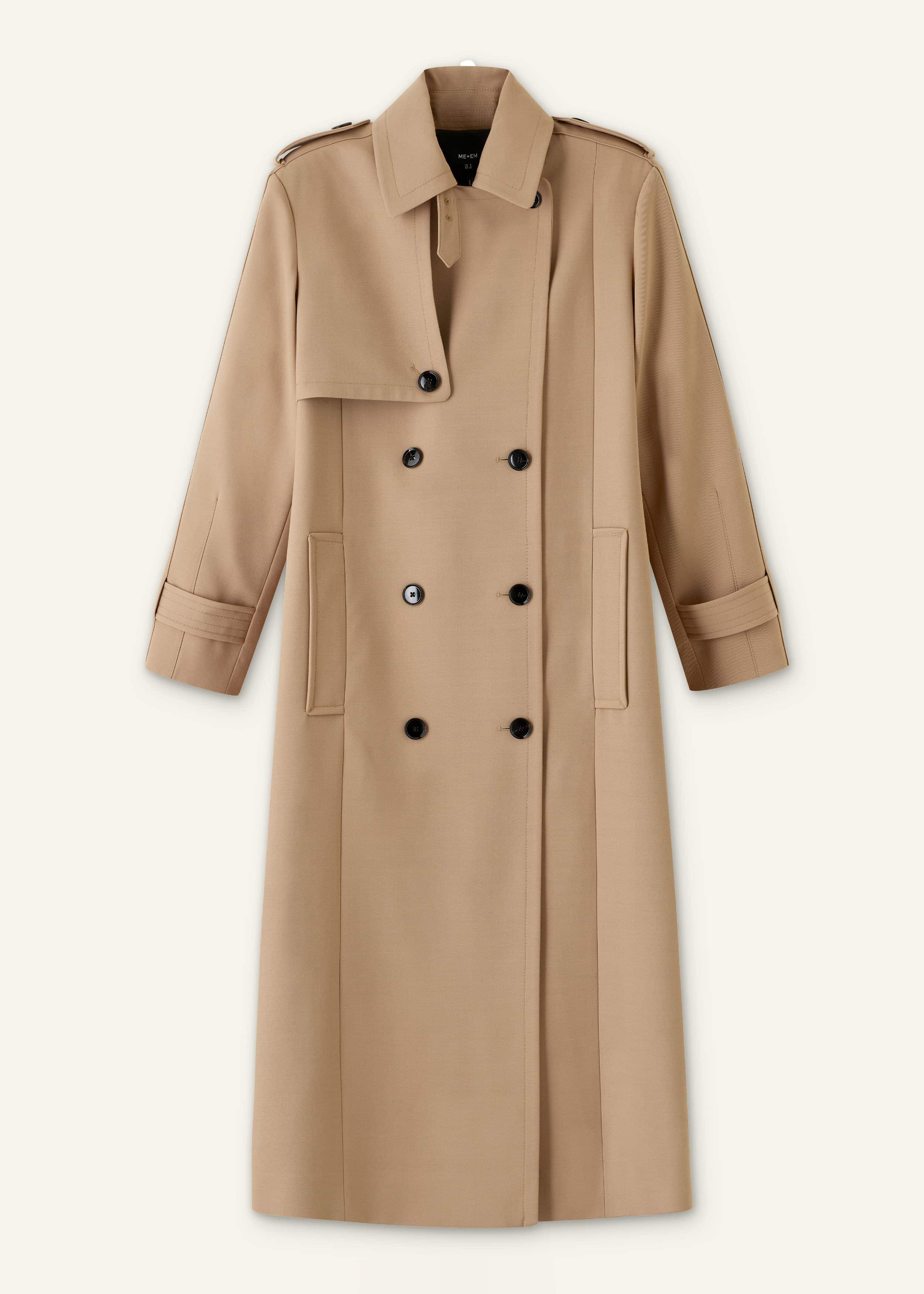 Our relaxed take on the classic trench made from water-resistant wool-blend tailoring that holds its shape whilst still achieving a fluid drape. It’s designed with padded shoulders that create soft structure, whilst the optional tie belt creates a more fitted finish. FIT Double breasted Button through front Long sleeves Functional pockets Relaxed fit Longline MODEL WEARS Model is a US size 4, wearing a US size 4 Model height is 5'9.5"" / 177cm Fits true to size with a relaxed fit - we recommend sizing down for a more fitted look COMPOSITION Main Fabric: 52% Polyester, 46% Wool, 2% Elastane Body Lining: 100% Viscose Sleeve Lining: 51% Polyester, 49% Elastomultiester Crafted from water-resistant wool-blend tailoring fabric with a clever blend of structure and fluid drape. This style has a stretch-infused sleeve lining for added comfort.