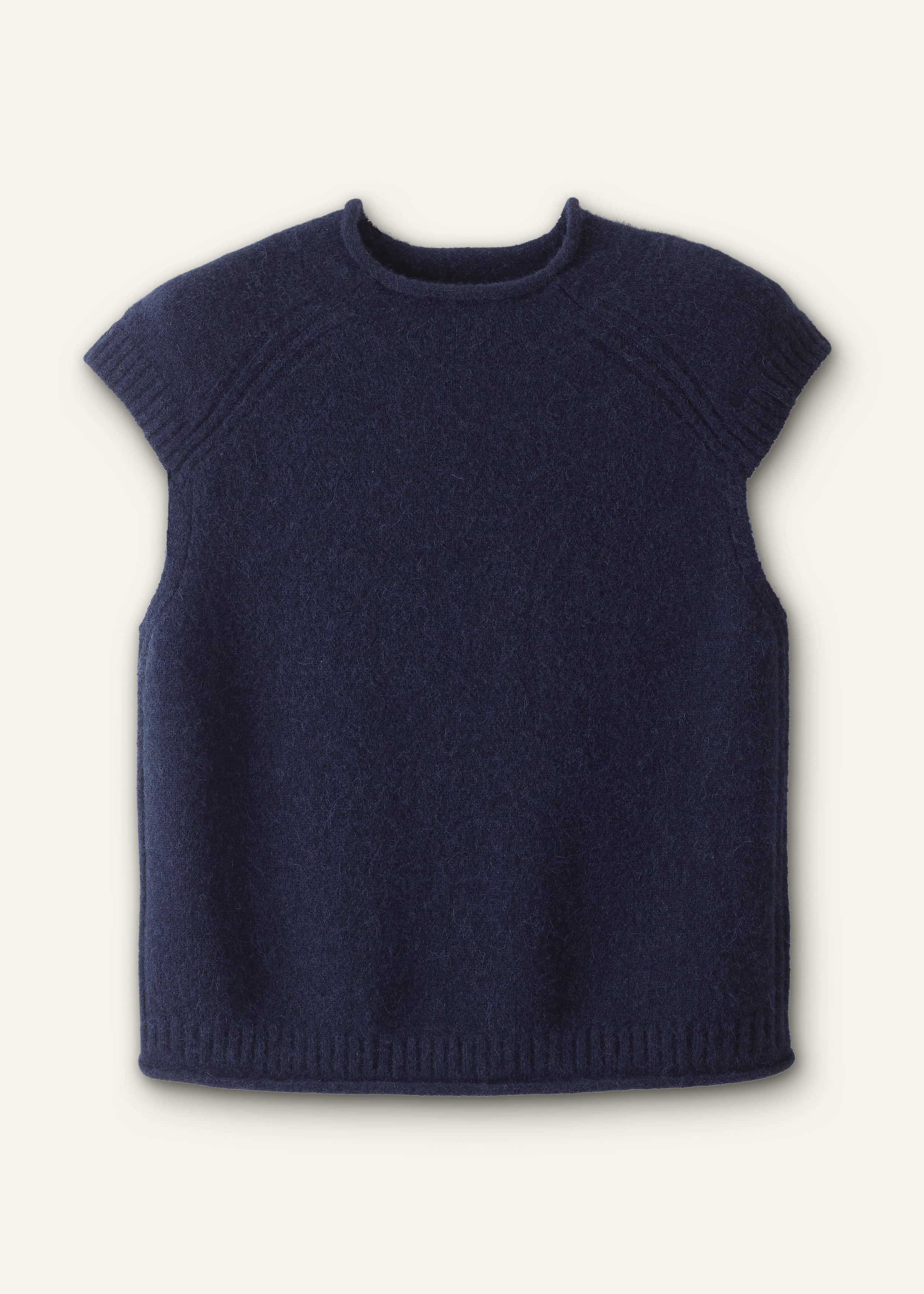 A fresh take on our signature layering sweater vest, this piece features dropped armholes for proportionate coverage and a rolled trim at the neckline and hem. It’s made from an alpaca blend for a soft feel, with comfortable stretch and recovery. FIT Straight shape High grown-on neckline Sleeveless with slightly dropped armhole positioning Standard body length Level hem MODEL WEARS Model is a US size 4, wearing a size S Model height is 5’11” / 180cm COMPOSITION 60% Alpaca, 38% Recycled Polyamide, 2% Elastane Crafted from responsibly sourced alpaca wool blended with recycled polyamide for added stretch and recovery.