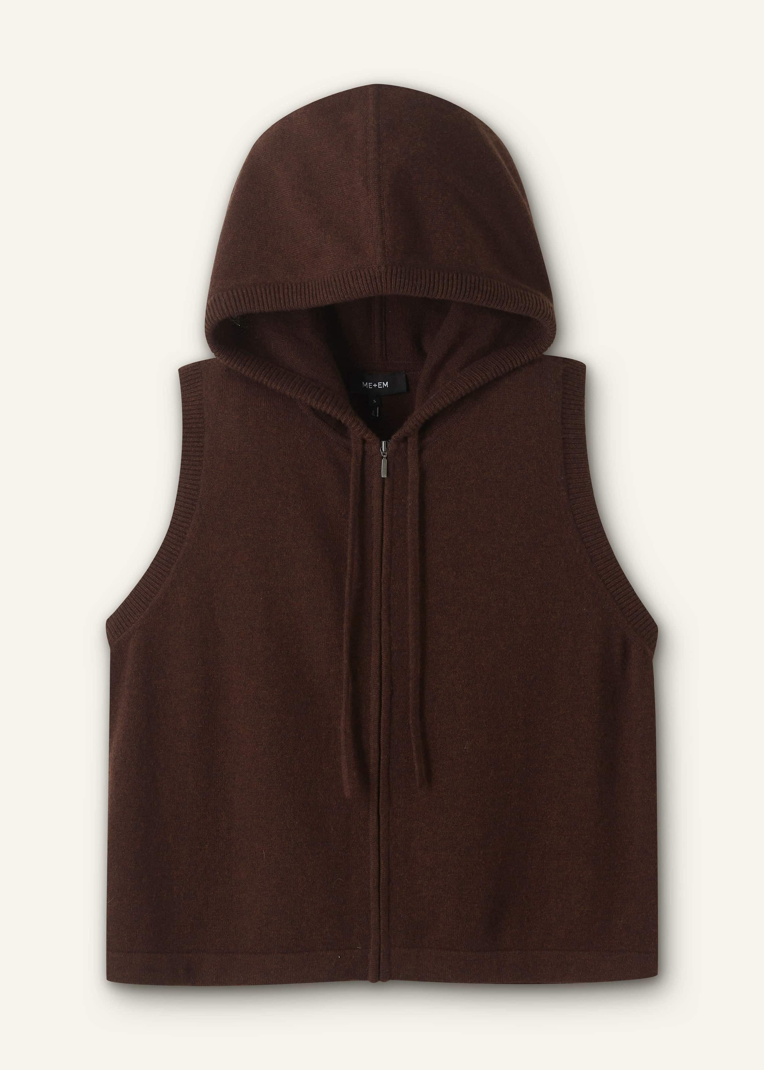 In a deep brown hue, this hoodie is crafted from luxuriously tactile cashmere. Its sleeveless cut is intelligently engineered to slot seamlessly over shirts and under coats for a bulk-free finish. FIT Relaxed straight fit Hooded with a drawstring channel through the hood Set-in armhole position Sleeveless Standard body length Level hem MODEL WEARS Model is a US size 4, wearing a size S Model height is 5ft 10in / 178cmFits true to size COMPOSITION 100% Cashmere Crafted from luxuriously soft cashmere yarn, knitted in a plain jersey stitch with ribbed trims. We've worked hard to make sure this yarn is low pilling but this is a characteristic of soft natural yarns and can be restored with delicate washing according to the care label and the use of a knitwear comb.