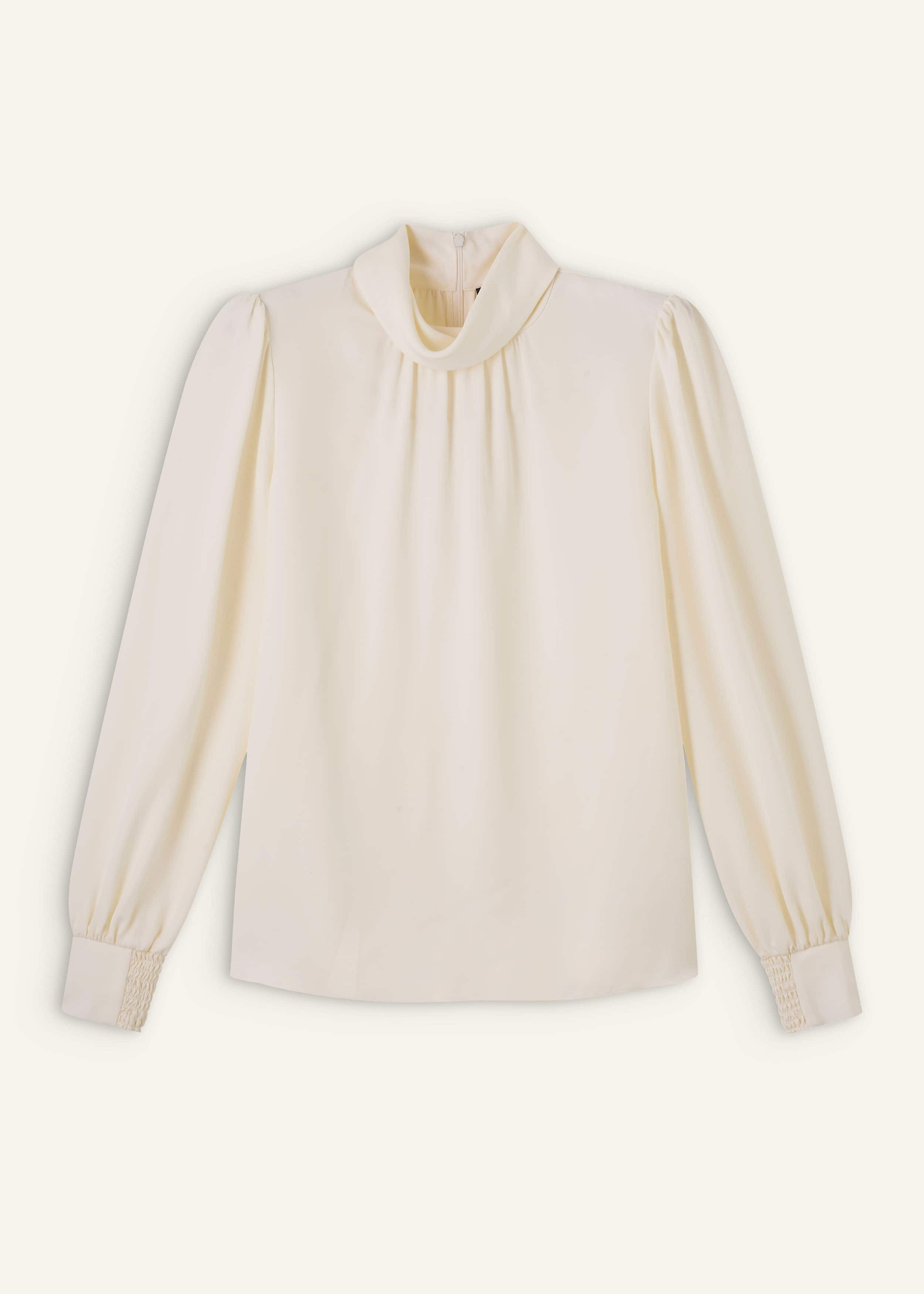 An instant outfit elevator, this top is made from sumptuous, supersoft silk in a clean cream hue. The high neckline and voluminous sleeves create a fluid draped effect. FIT Straight body High neck stand Center-back zip fastening Half-shirred cuffs MODEL WEARS Model is a US size 4, wearing a US size 4 Model height is 5'10” / 178cm Fits true to size COMPOSITION 100% Silk Crafted from mid-weight silk with a fluid, super-soft handfeel and a matte finish.