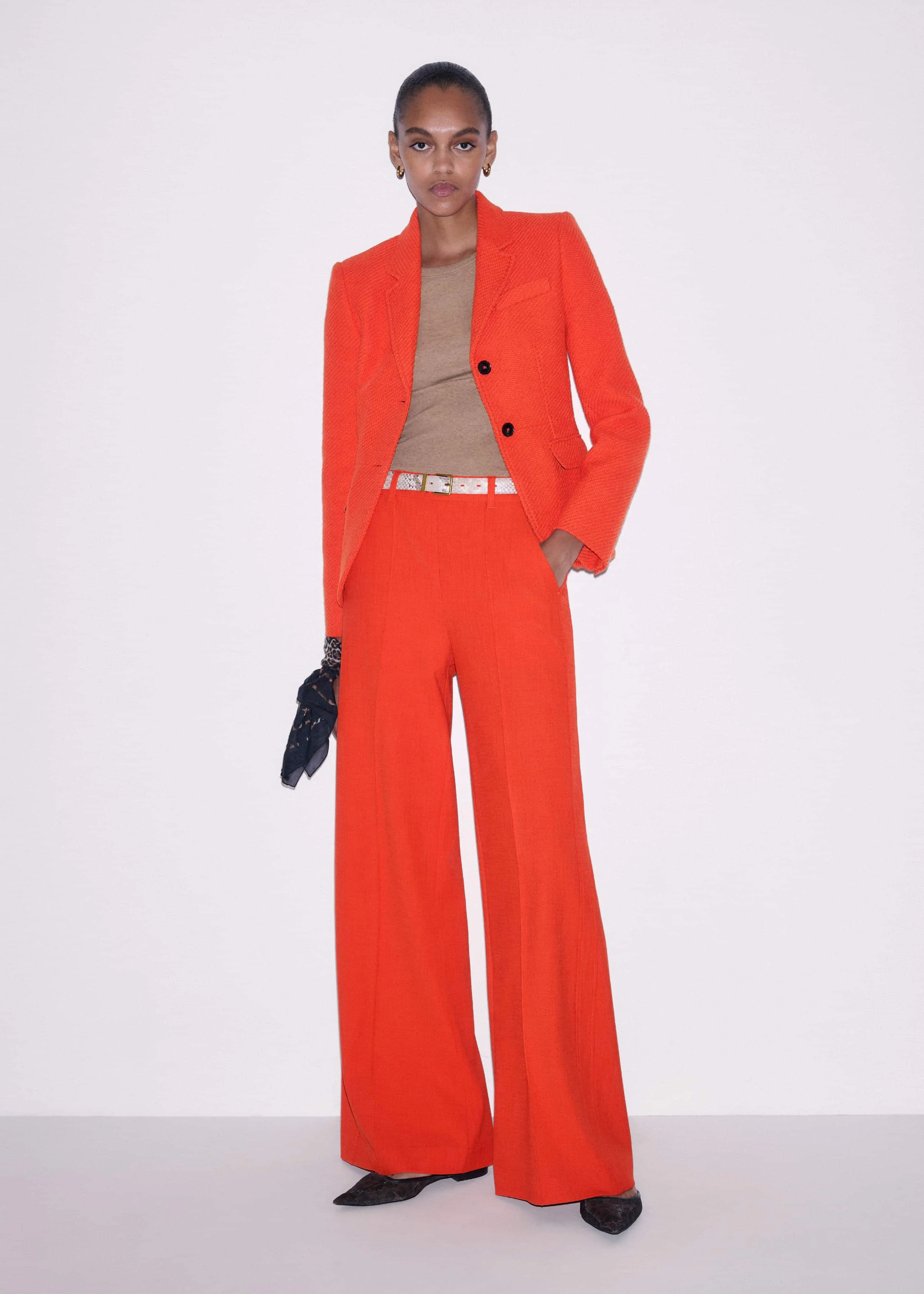 Tangerine Orange is granted a precisely tailored form to create this suit. The sculpted jacket can be worn with either our wide-leg pant or straight crop pant for a colorful head-to-toe finish, or mixed and matched as a bold pairing with other separates in your wardrobe. FIT Slim fit Long sleeves Mid length Functional pockets Centre front button opening Straight leg Tailored fit Cropped length Wide leg Full length Mid rise Centre-back zip fastening MODEL WEARS Model is a US size 4, wearing a US size 4 Model height is 5’11” / 180cm Fits true to size COMPOSITION Main Fabric: 75% Organic Cotton, 17% Polyester, 7% Viscose, 1% Elastane Body Lining: 100% Recycled Polyester Crafted from an Italian tailoring fabric, made from a blend of organic cotton and viscose fibres for a soft yet structured feel. Main Fabric: 67% LENZING™ ECOVERO™ Viscose, 31% Polyester, 2% Elastane Crafted from an Italian tailoring fabric, made from a blend of LENZING™ ECOVERO™ viscose fibres for a soft yet structured feel. Lining: 100% Recycled Polyester
