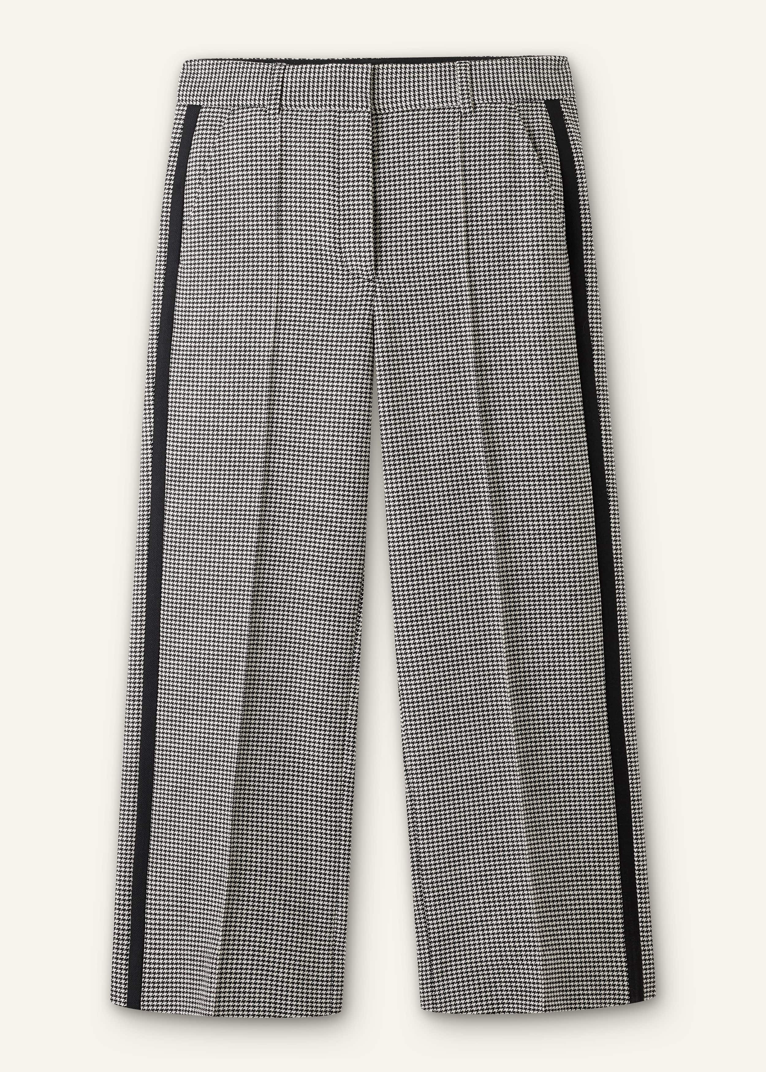This graphic straight-leg pant combines heritage houndstooth with our signature sport-smart side stripe. The pressed seams add structure through the straight crop silhouette, which finishes at just the right part of the ankle to accommodate your pick of shoe styles. FIT Mid rise Straight leg Functional pockets Hook and bar fastening Cropped/ ankle length MODEL WEARS Model is a US size 4, wearing a US size 4 Model height is 5'10.5” / 179cm Fits true to size COMPOSITION 62% Polyester, 26% LENZING™ ECOVERO™ Viscose, 9% Wool, 3% Elastane Crafted from a Portuguese tailoring fabric, made from a blend of LENZING™ ECOVERO™ viscose fibres which has a soft yet structured feel and a classic brushed surface.