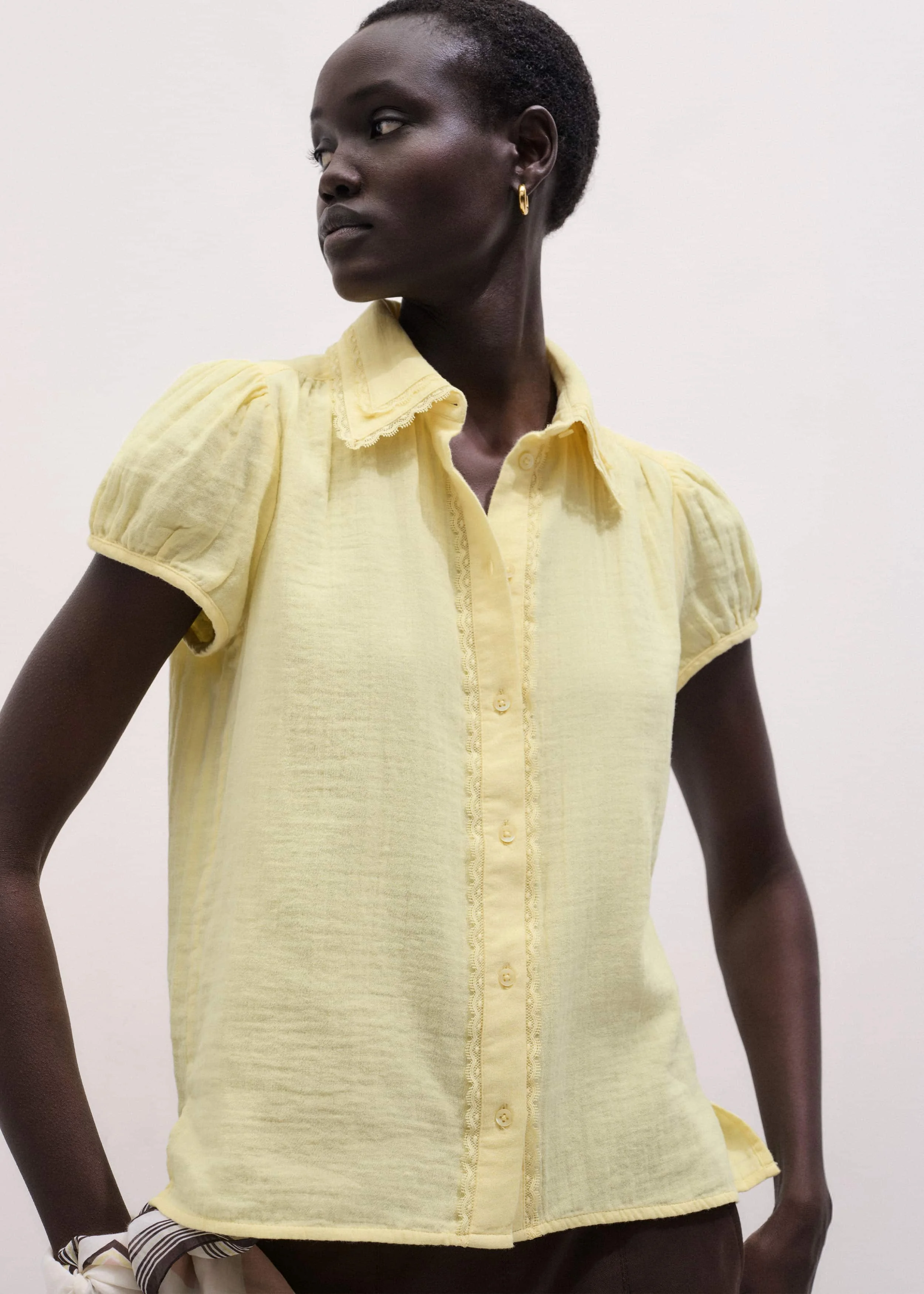 Cheeseloth + Dusted Lemon Yellow is the ultimate solution to warm-weather dressing. This blouse is granted a feminine edge with a scallop embroidered trim at the collar and placket and short voluminous cap sleeves. FIT Straight body Regular length Cap sleeves Collared neckline Button down front MODEL WEARS Model is a US size 4, wearing a US size 4 Model height is 5'10"" / 178cm Fits true to size COMPOSITION Main Fabric: 100% Cotton Lace: 100% Polyester Lightweight and breathable, this double-gauze cotton cheesecloth fabric has a naturally textured surface for an iron-free finish.