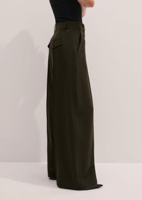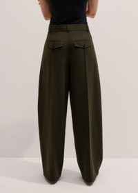 Meet the go-to pant for achieving a neat shape with the comfort of a relaxed, looser leg. The tapered silhouette has pintucked front seams and a soft curve through the leg that narrows toward the hem for the perfect ‘puddle’ over footwear. FIT Mid rise Functional pockets Tapered leg Full length Centre front button MODEL WEARS Model is a US size 4, wearing a US size 4 Model height is 5'10.5” / 179cm Fits true to size COMPOSITION Main Fabric: 43% Wool, 53% Polyester, 4% Elastane Pocket Lining: 100% Recycled Polyester Crafted from a classic wool-blend tailoring fabric, which has a soft and fluid feel and a classic brushed surface.
