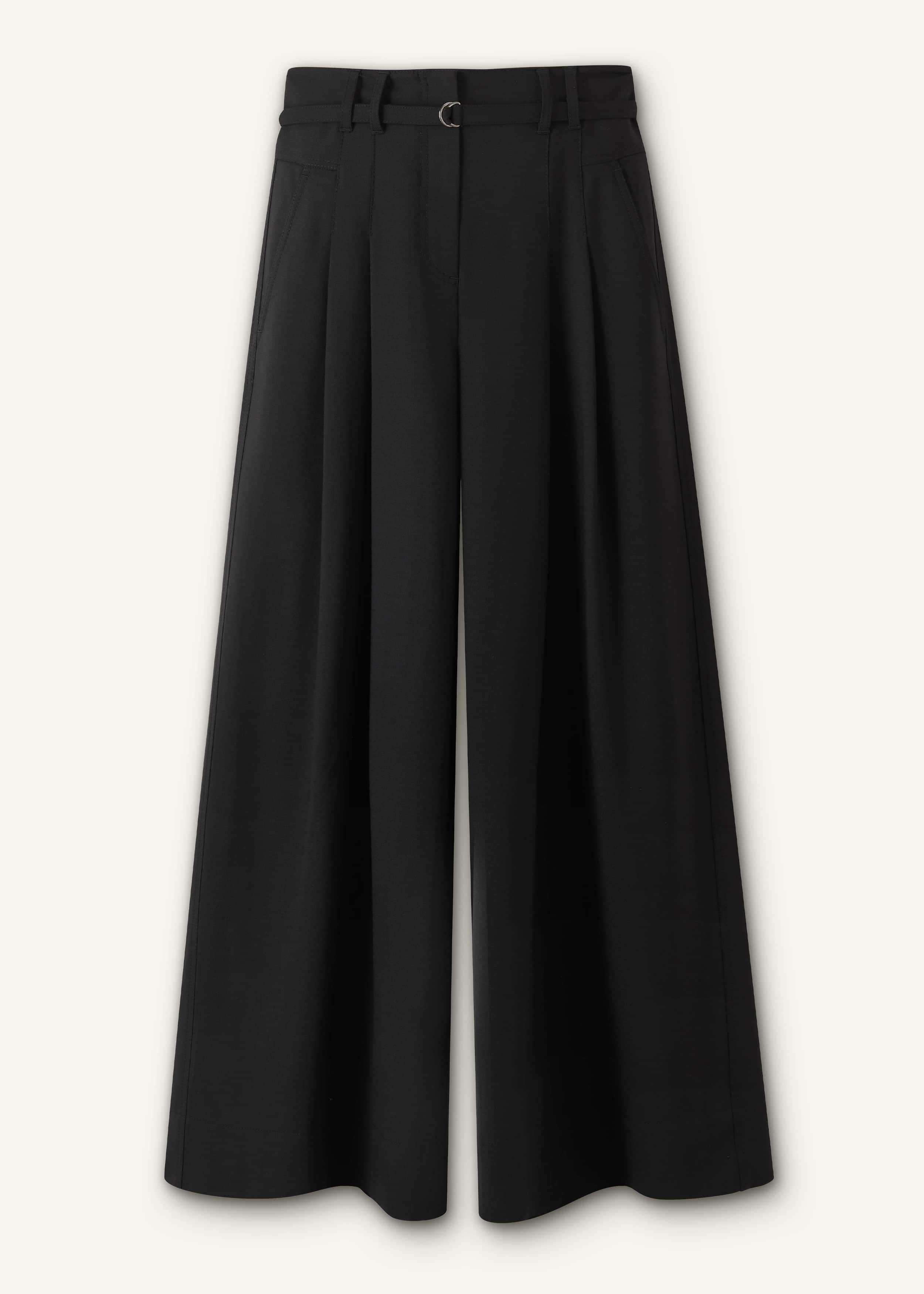 The ultimate eveningwear pant, this black pair is cut to our ultra-wide leg silhouette. The stitched-down pleats give clean, controlled volume through the leg. FIT High waist Relaxed fit Ultra wide leg Hook-and-bar fastening D-ring and clever belt construction to fit different sized belts Full length Available in two different lengths MODEL WEARS Model is a US size 4, wearing a US size 4 Model height is 5'8"" / 173cm Fits true to size COMPOSITION 43% Wool, 53% Polyester, 4% Elastane Crafted from a classic wool-blend tailoring fabric, which has a soft yet structured feel and a classic brushed surface.