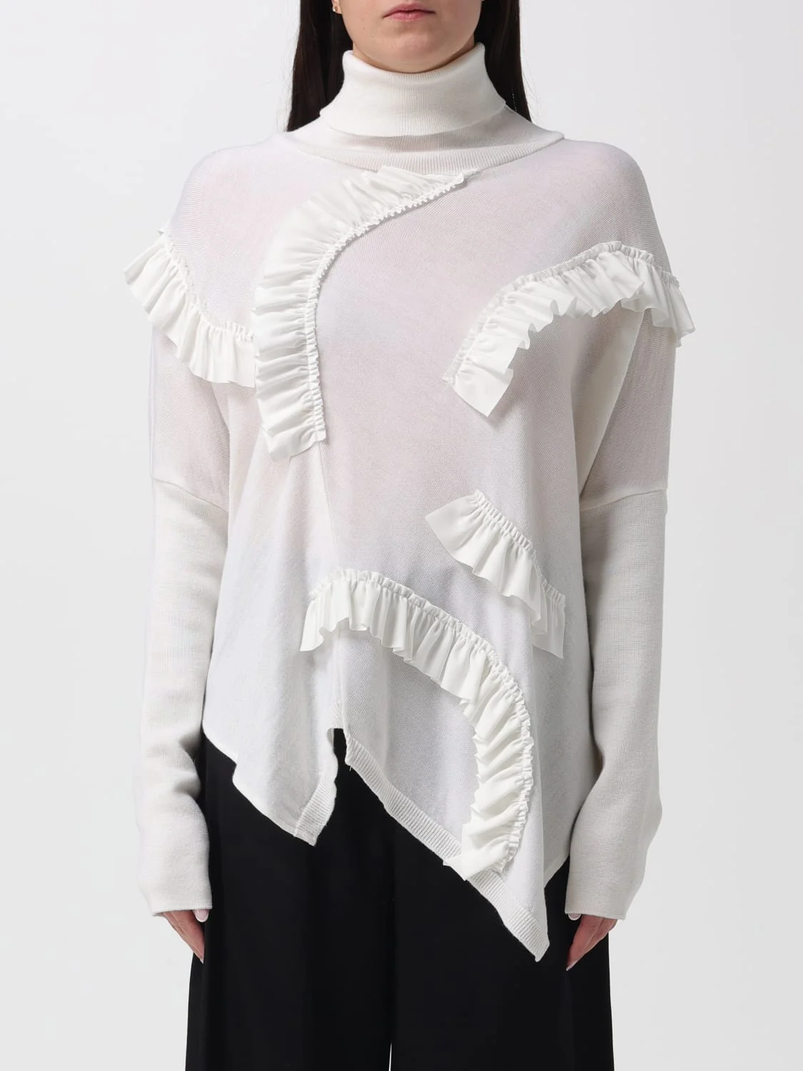 DESCRIPTION - Style: Contemporary - Details: With ruffles - Neck: Turtleneck - Shoulders: Relaxed - Sleeves: Long - Bottom: With asymmetric hemline - Materials: Virgin wool - Pattern: Embroidery, Plain-colored DETAILS AND CARE Composition 1)100%WV SIZE AND FIT Sizes not available Size and fit Slim fit Designer code: M5FZ64 11791 Giglio Code: 436384 Designer: Meimeij Collection: Meimeij Woman Category: Clothing Meimeij