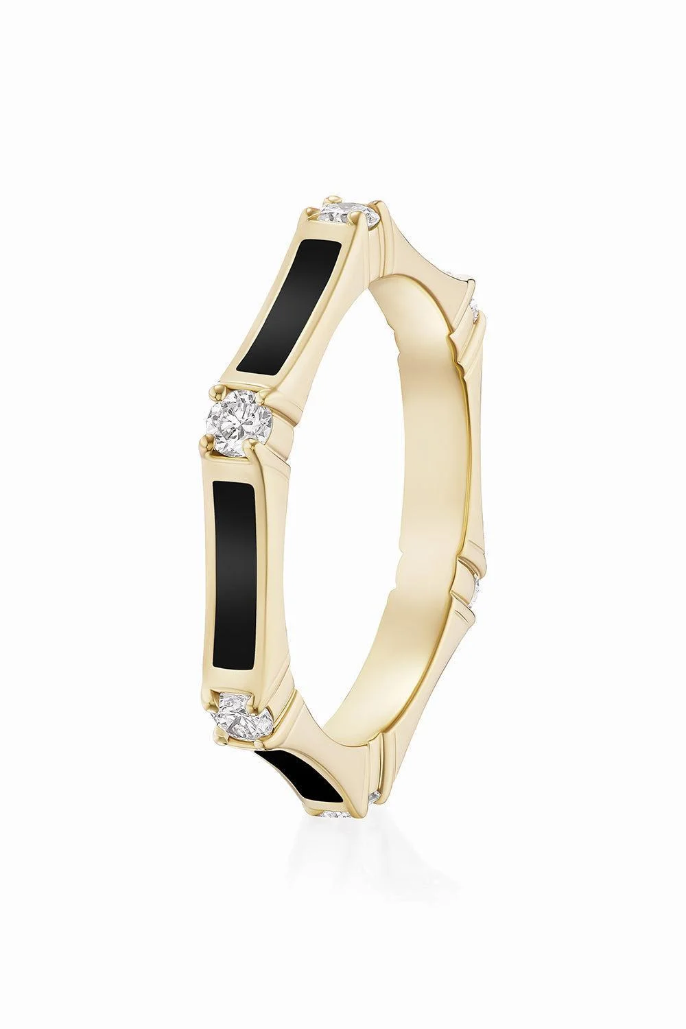 DETAILS AND INSIGHT Melissa Kaye black honey diamond station ring in yellow gold. 18K Yellow Gold, Black Enamel 3mm W Diamonds (0.37 Tcw) Style R2409A-Y